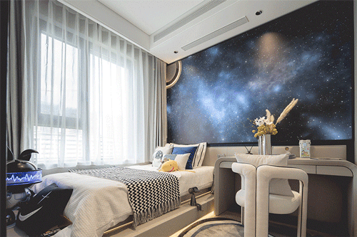 星空元素装扮的儿童房承载着男孩成为宇航员的梦想,丰富着男孩的成长记忆。满怀希望奔赴热爱,日复一日,终将驶向星辰大海,抵达梦想彼岸。