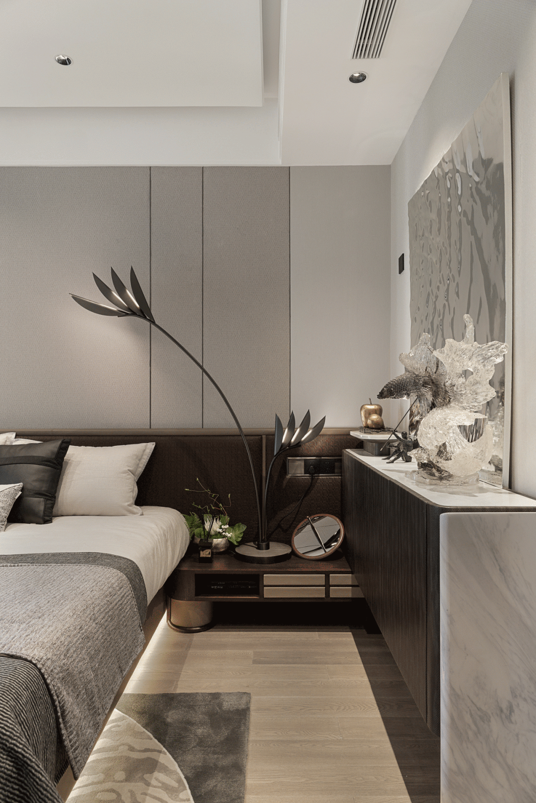 次卧无主灯设计延续优雅安静的氛围,质朴的色系在不经意间传递着大度包容的态度。艺术装置赋予空间轻松和活泼的趣味,集娱乐与休憩、放纵与克制等多样化元素于一体,平衡了文化的厚重感,含蓄地表达出居者对品质生活孜孜不倦的追求。