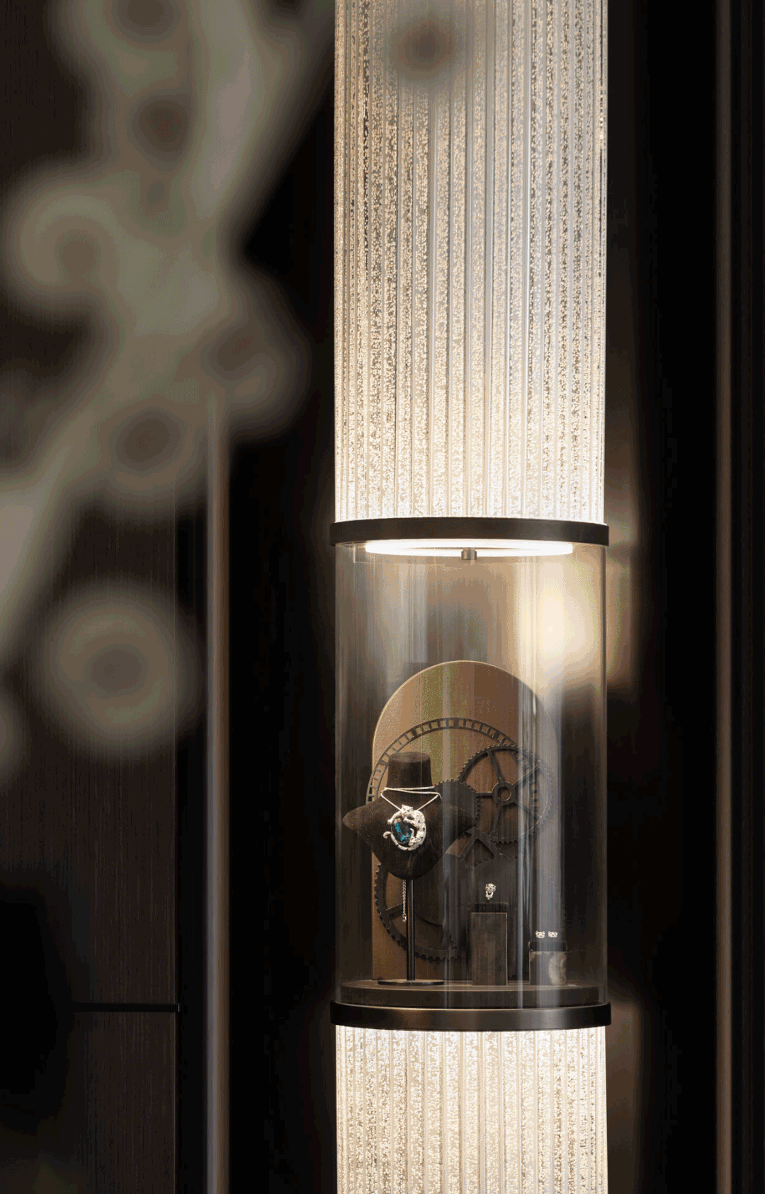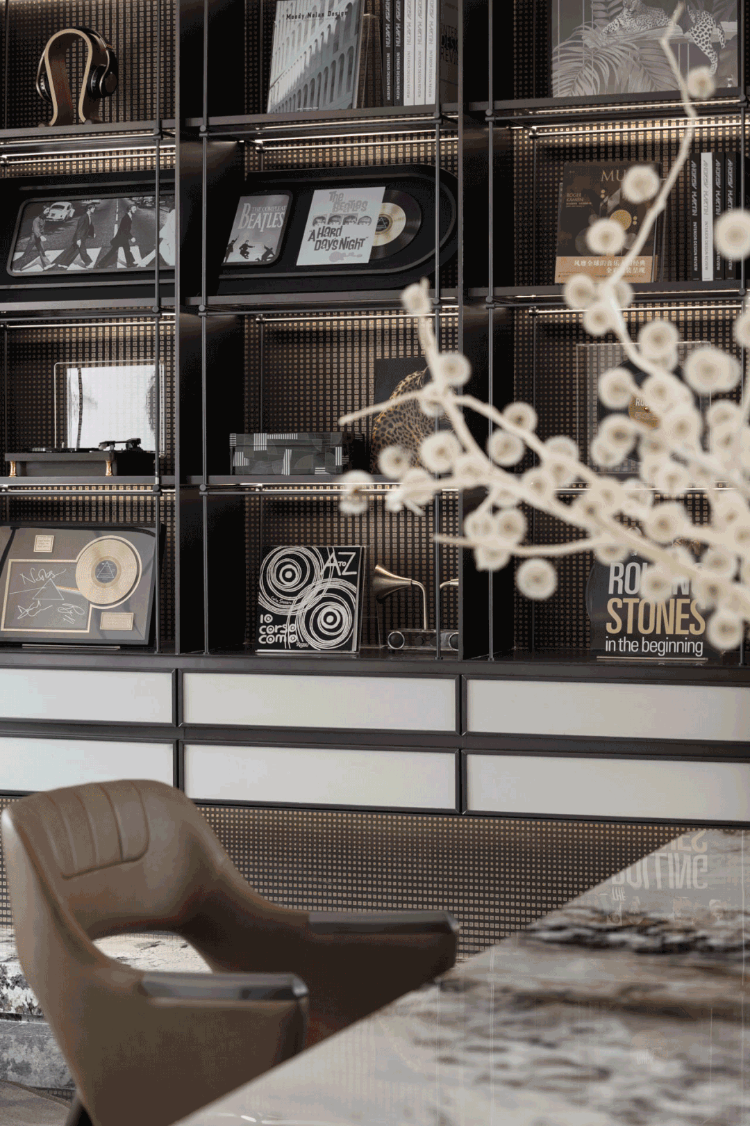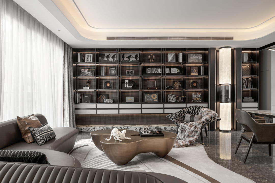 The corner of the living room is not constructed using traditional techniques, but rather an immersive jewelry exhibition, showcasing the unique elegance, nobility, wildness, composure, and confidence of the occupants.