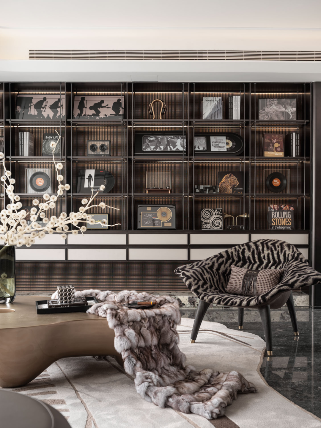 The cheetah element that runs through the entire house reaches its climax in space. They echo each other and are paired with line cut geometric background walls, embodying elegance, non fragility, wildness, and luxury everywhere, exuding a sense of rebellion, power, and freedom, which is haunting.