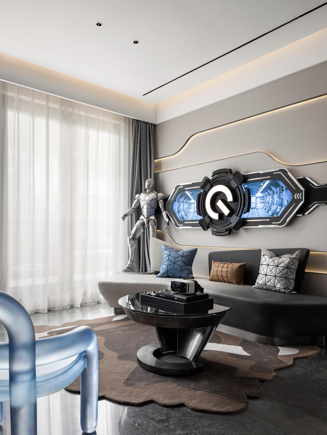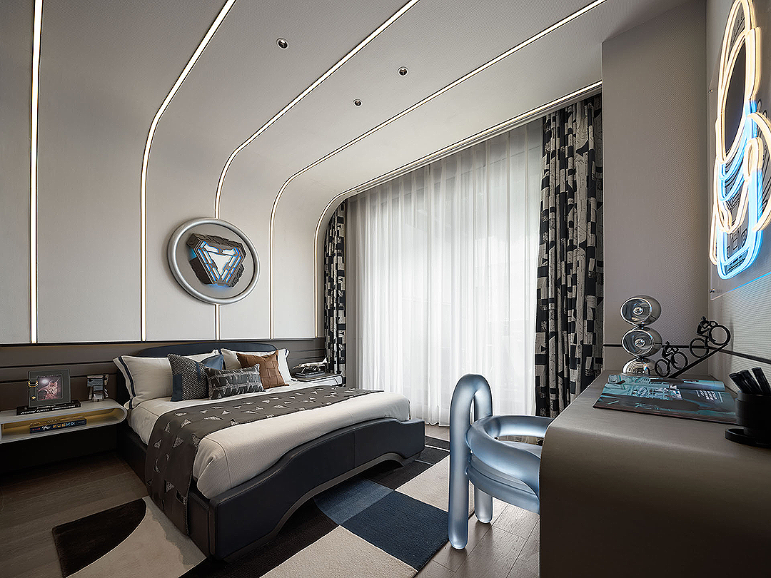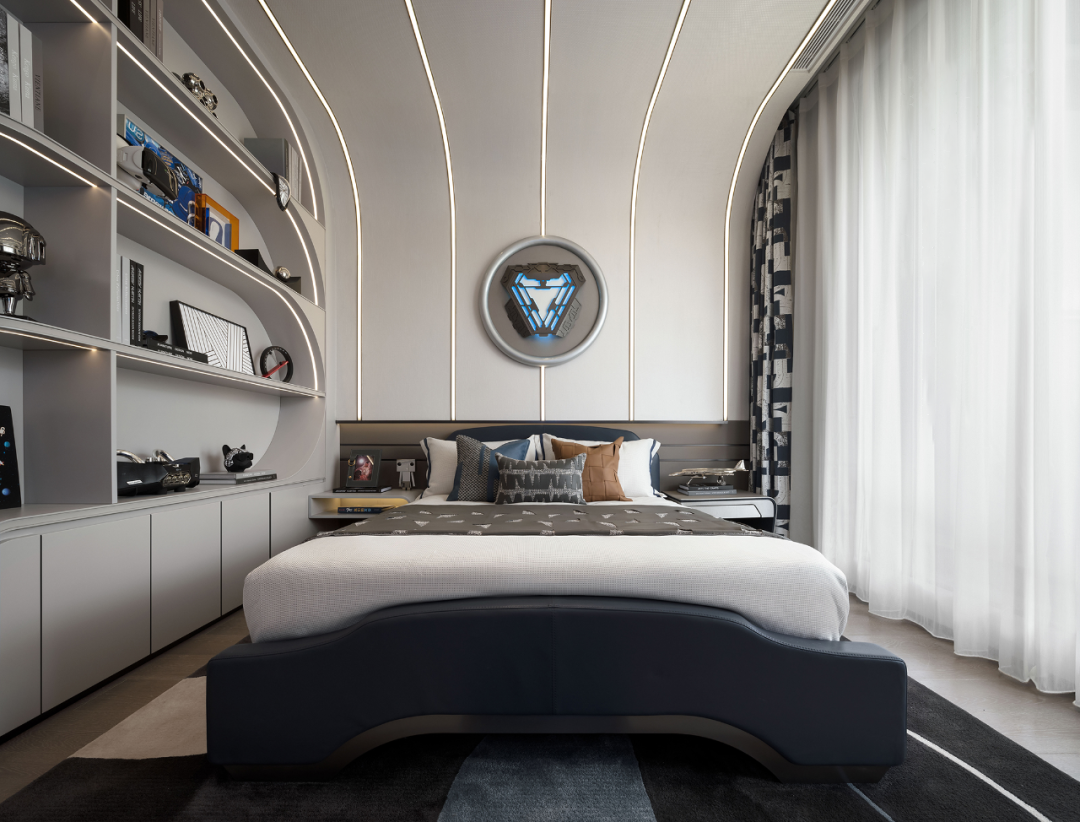 男孩房形似太空舱,选择电光蓝搭配具有韵律动感的摆件,融入科幻未来的元素,充满科技感和腔调。
