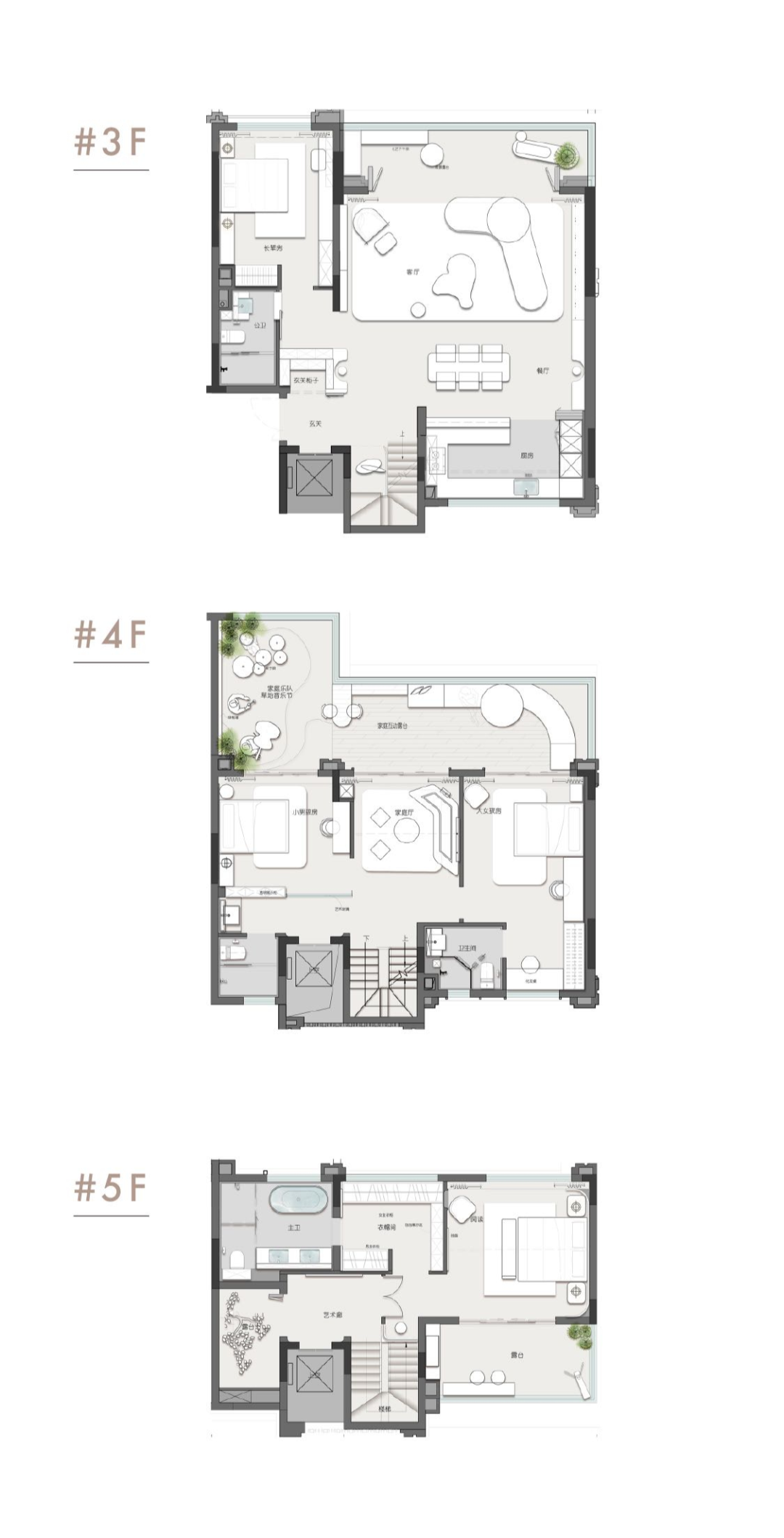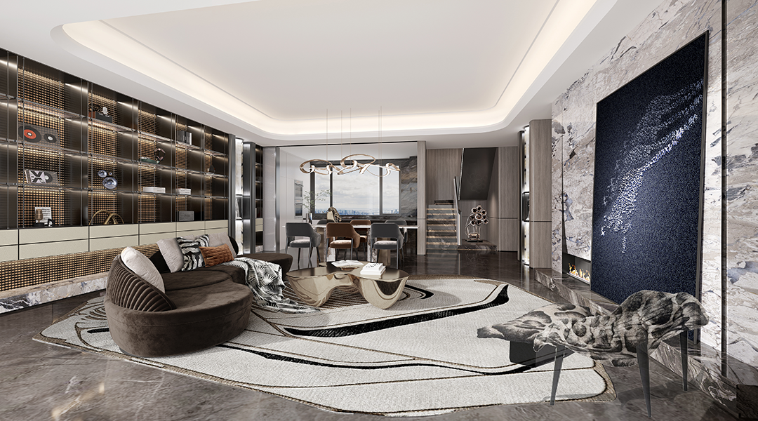 弧线流动的造型,增加律动感,时尚奢华、艺术品质的气息,衬托出奢华优雅的贵族品质。大面积落地窗打破室内与室外界线,艺术、自然、生活在同一个空间维度相互融合,让界限模糊,以此对话菁英圈层的生活品味和审美情趣,感受无限循环、无限延伸的艺术魅力。