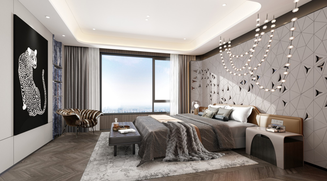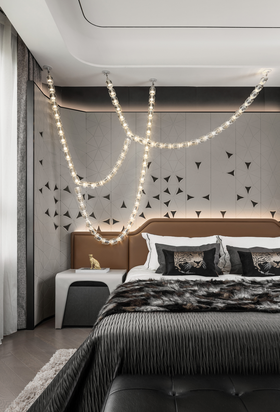 贯穿全屋的猎豹元素在空间中达到高潮。他们彼此呼应并与线条切割几何形状背景墙搭配、处处体现优雅不纤弱、野性又奢华,散发着叛逆、力量与自由的气息,令人魂牵梦萦。