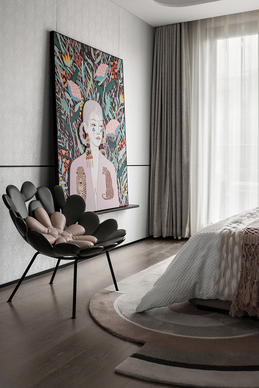 时光在相机中连接,反映过去与未来。长辈房的设计,在细节上抒怀藏意,赋予一副壁挂、一块地毯、一樽花艺等物以雅韵,让空间内部的文化意境与情绪场景融通,在盈透的光泽下,焕新整体格调。
