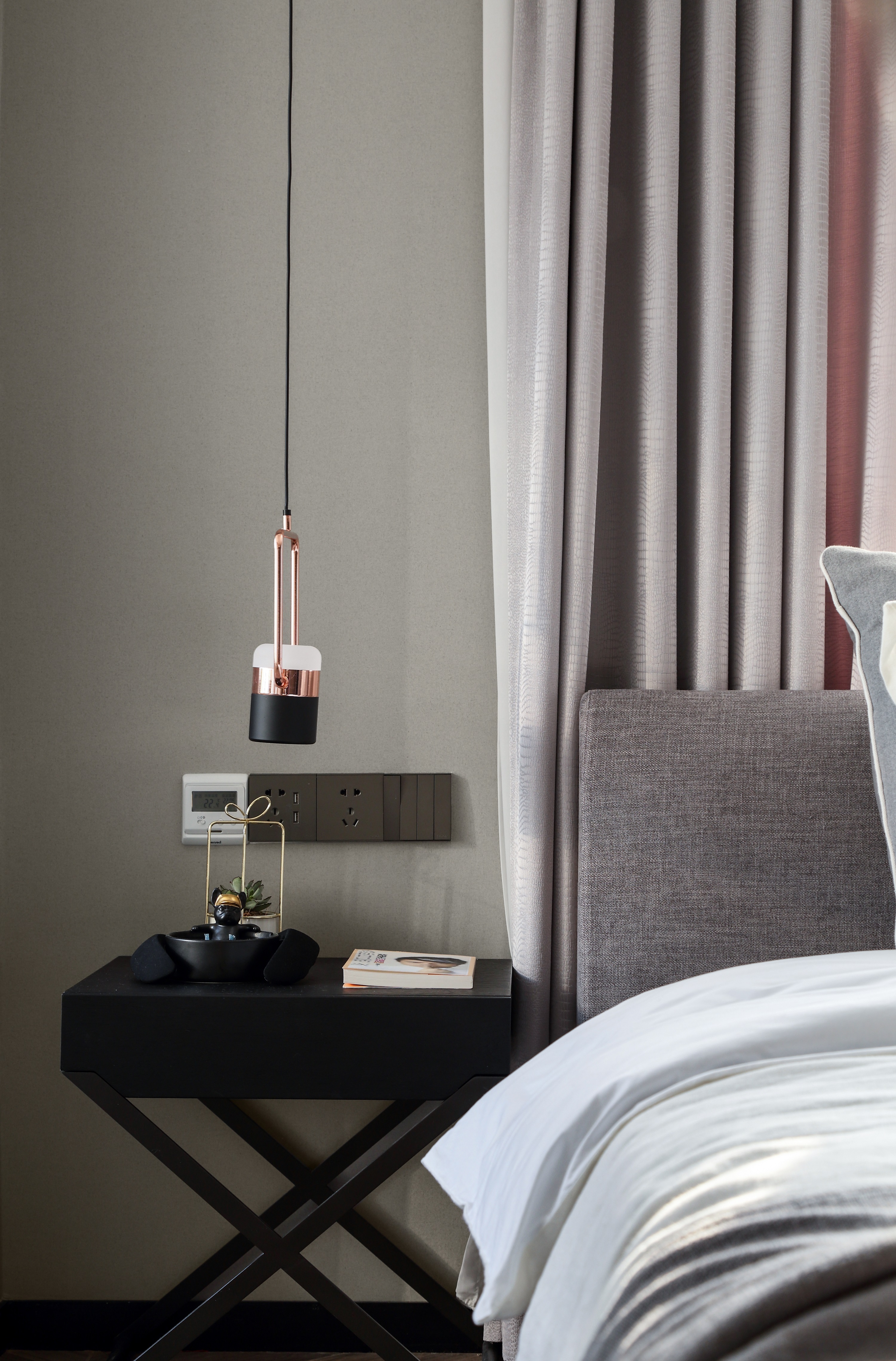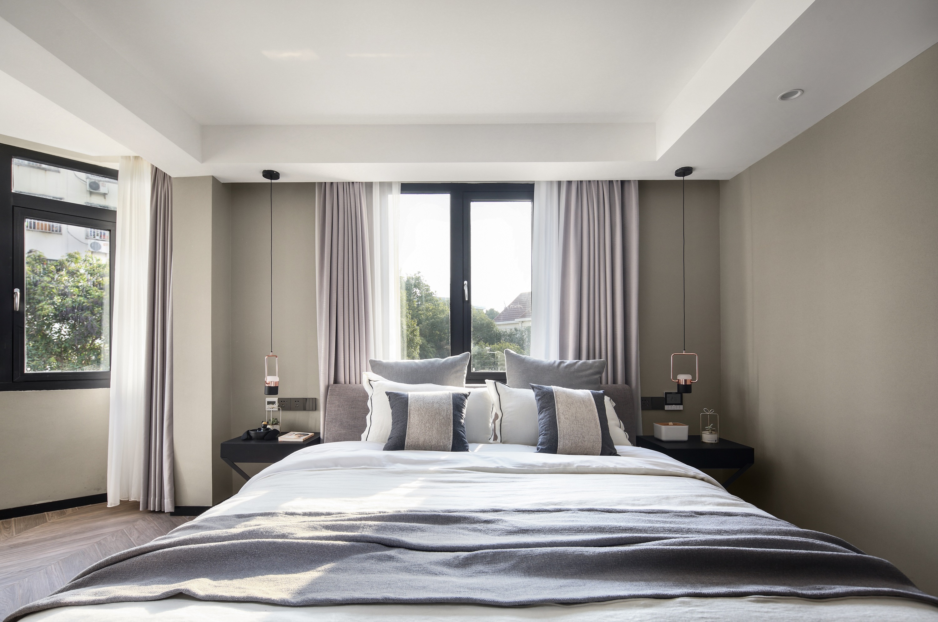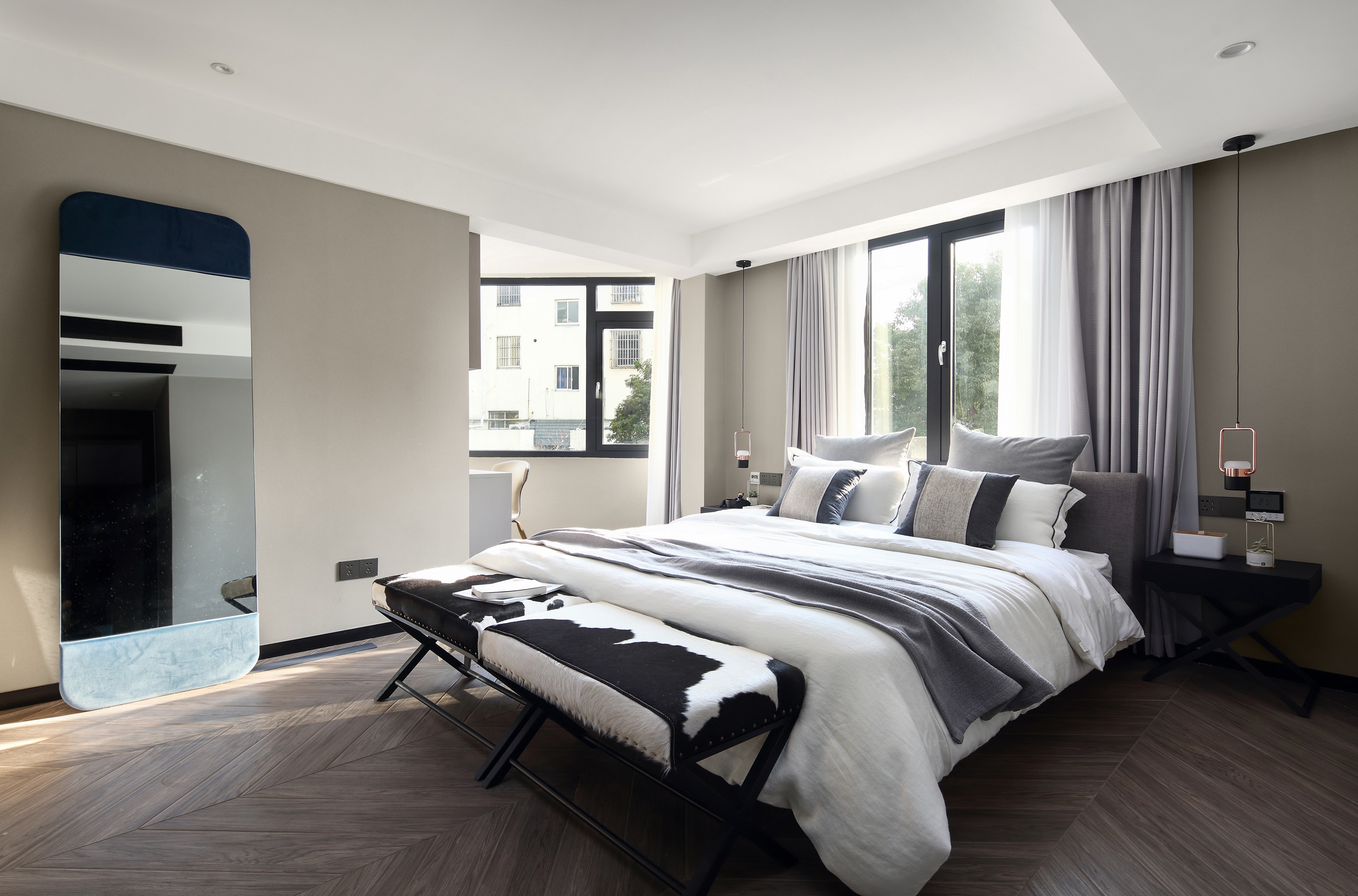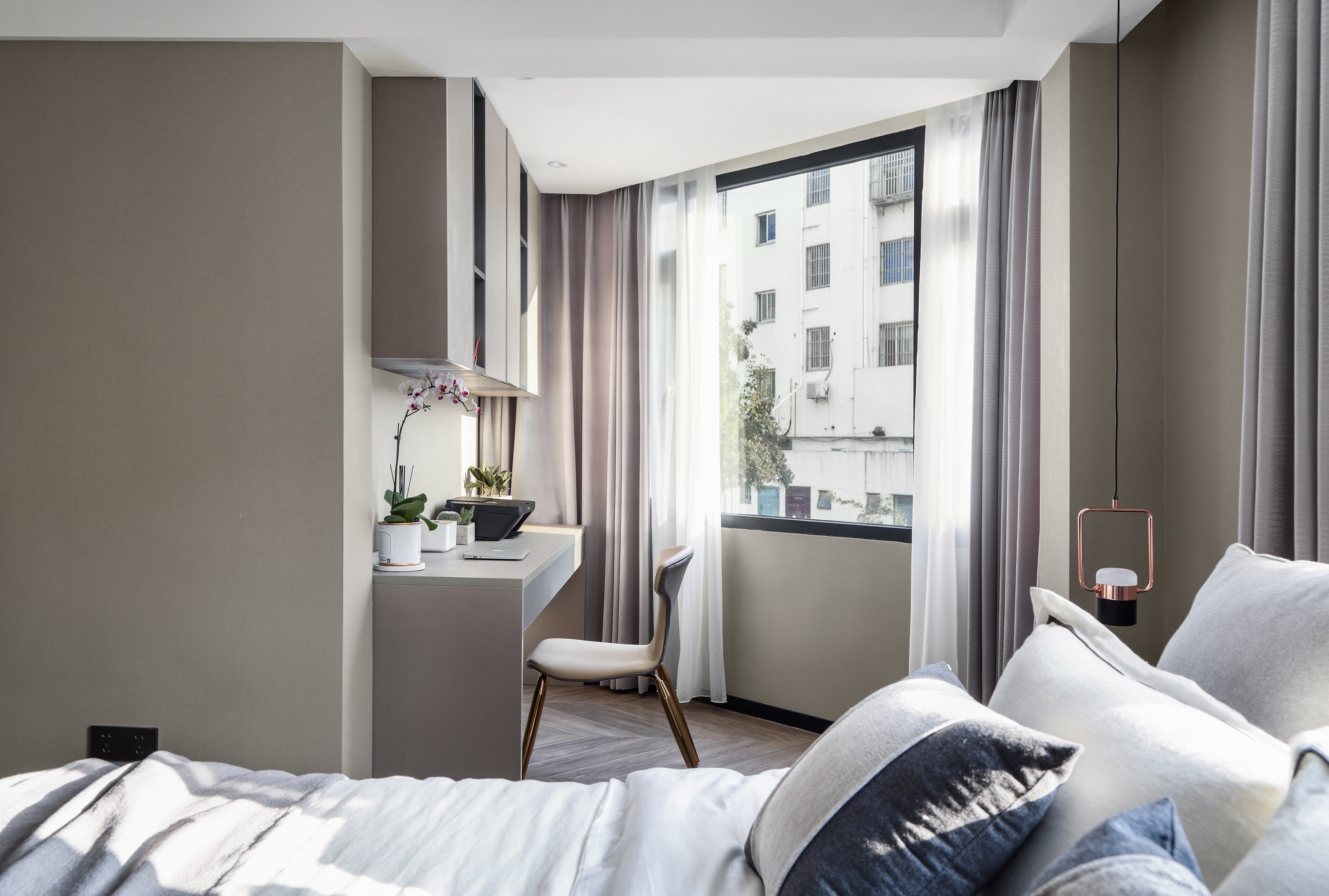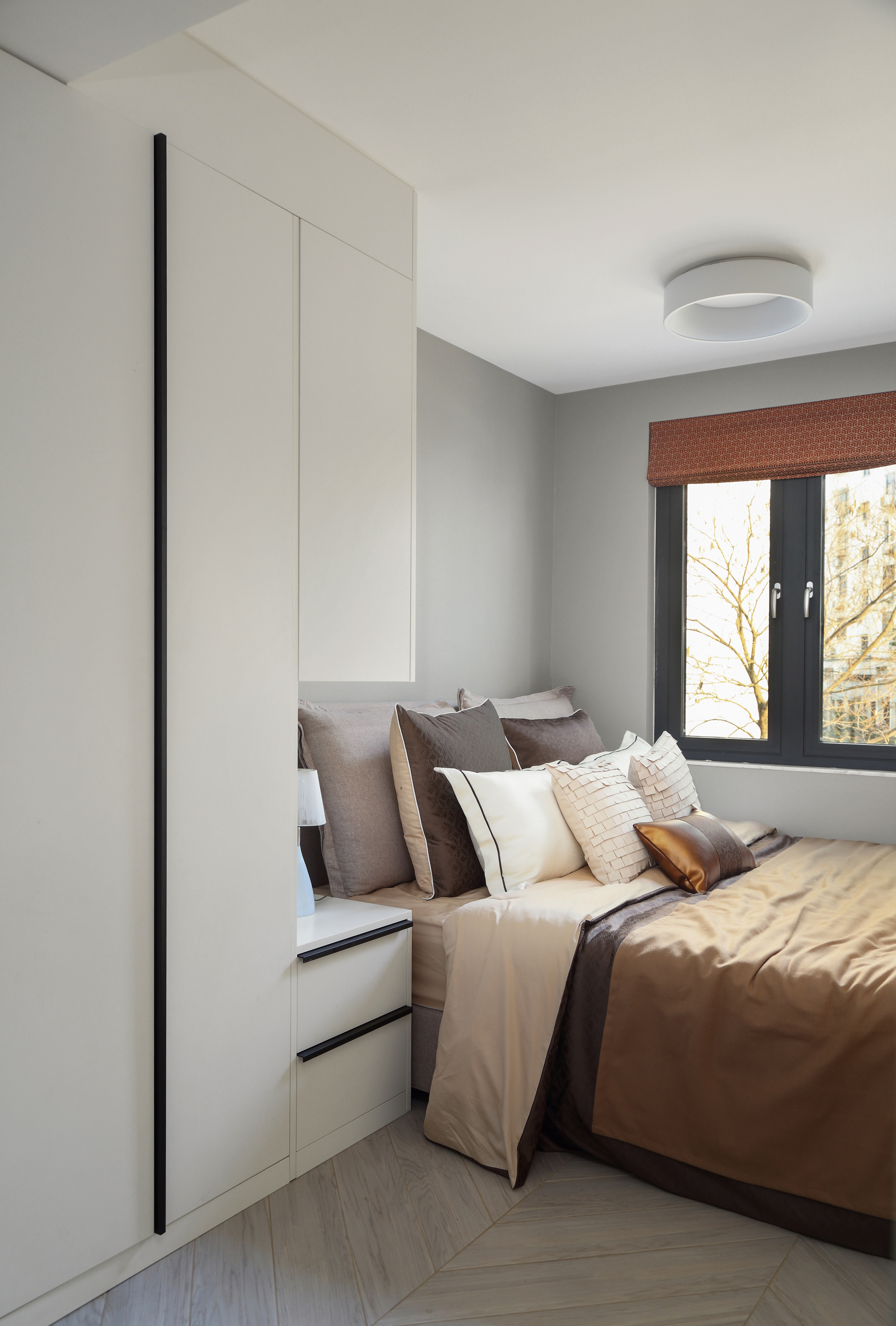 - After the door opening of the master bedroom is changed, one side of the top wardrobe is designed for entry, and a row of top wardrobe is also designed on the wall at the end of the bed, which increases the storage space.