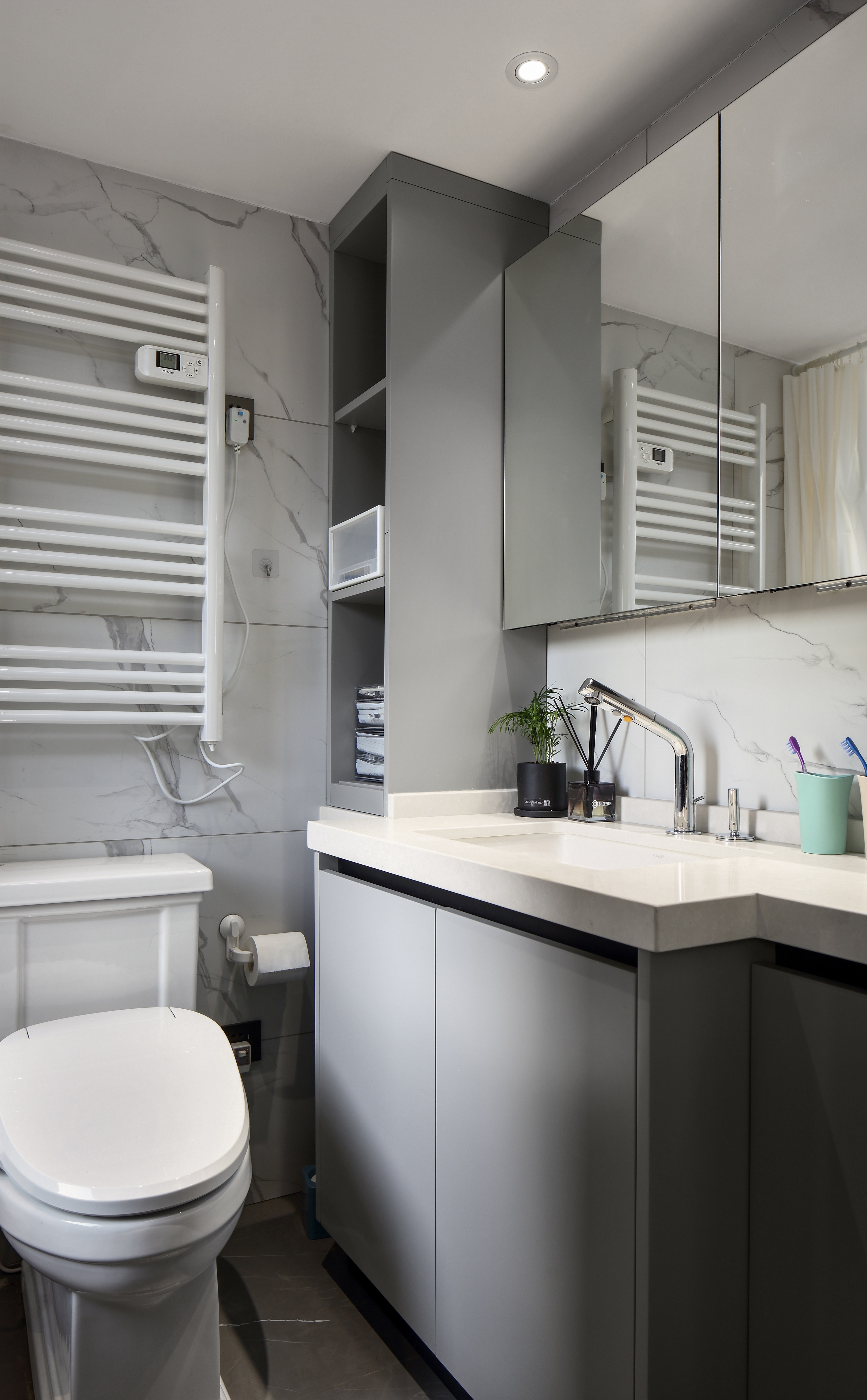- The laundry space is placed in the dry area of the external bathroom, which does not affect the use of shower and other functional areas.