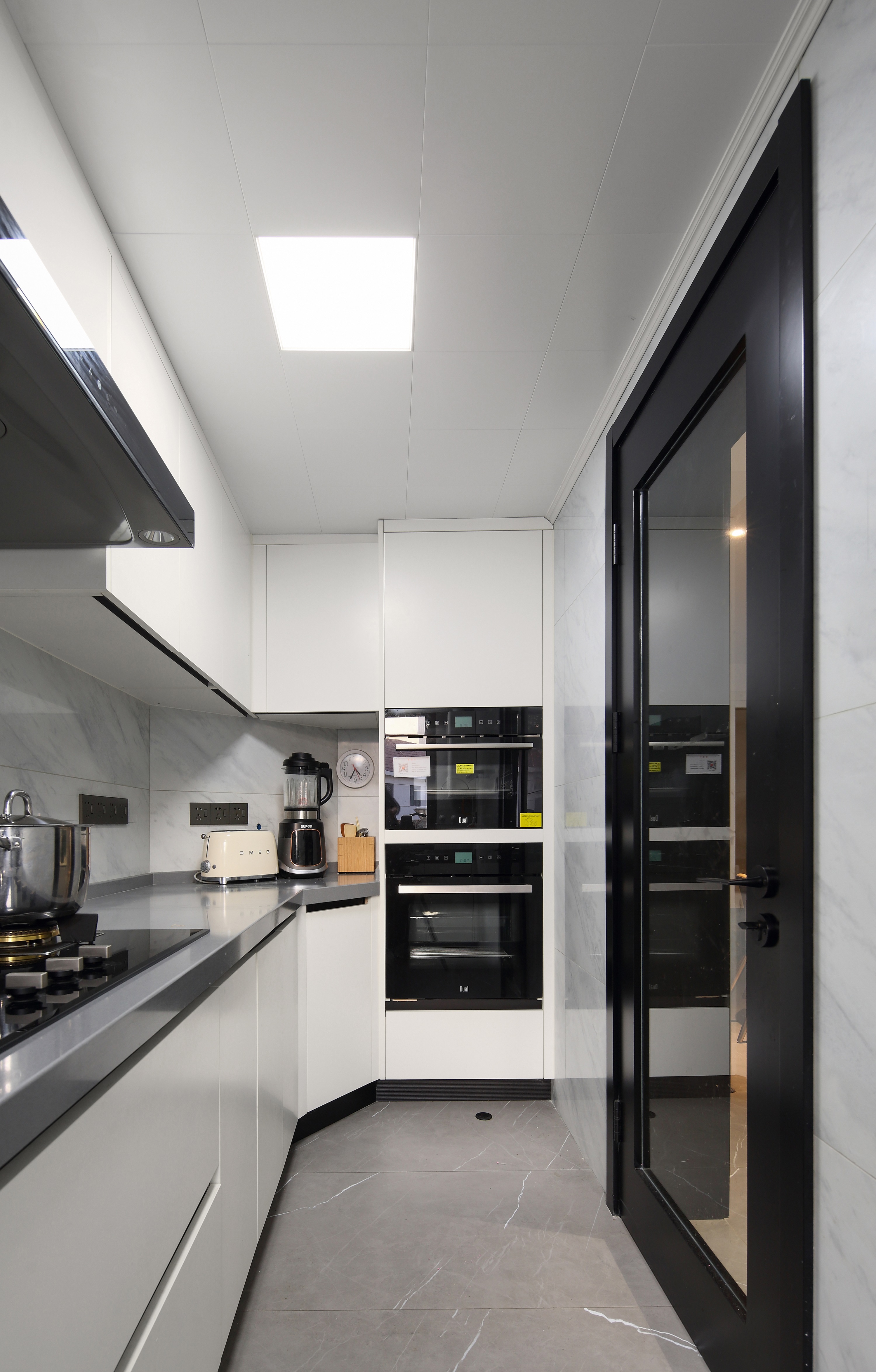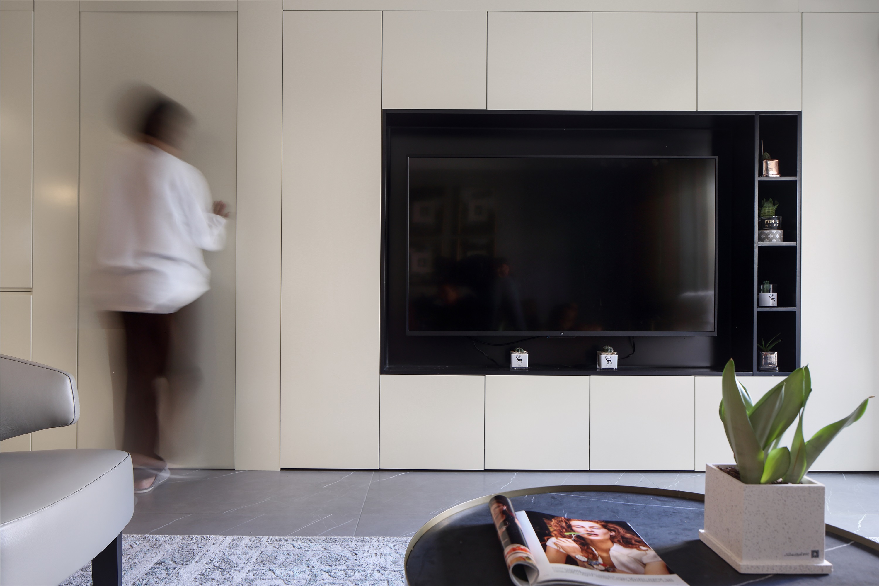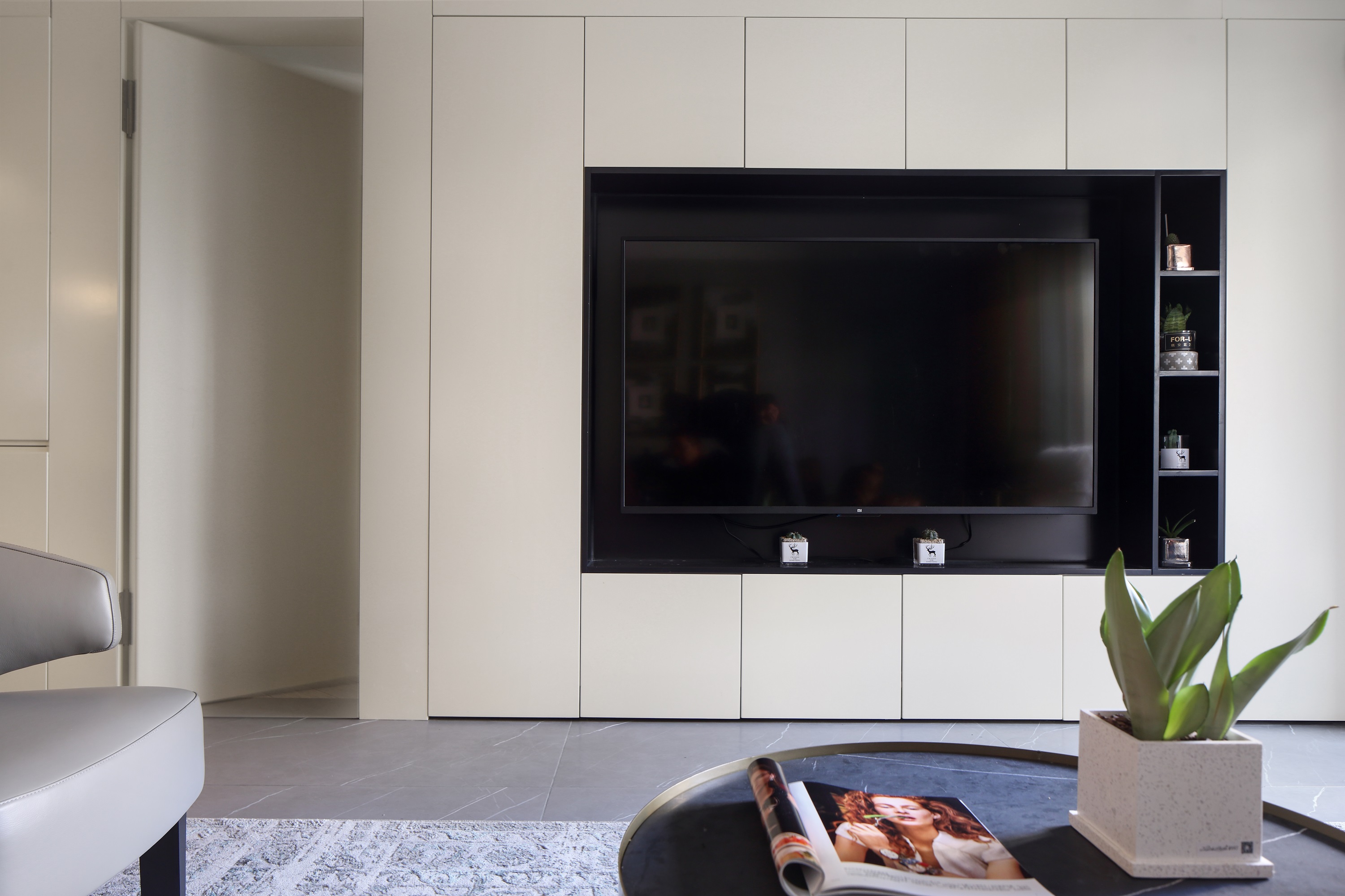 The previous storage room was demolished, and a shoe cabinet was reserved. The refrigerator originally planned to be placed in the kitchen was changed to the side of the shoe cabinet. In order to unify the appearance, an embedded refrigerator was selected. Open the door opening of the master bedroom to the middle of the dining room and the living room to ensure that the length of the sofa background wall in the living room can also be directly opposite to the wall TV wall.