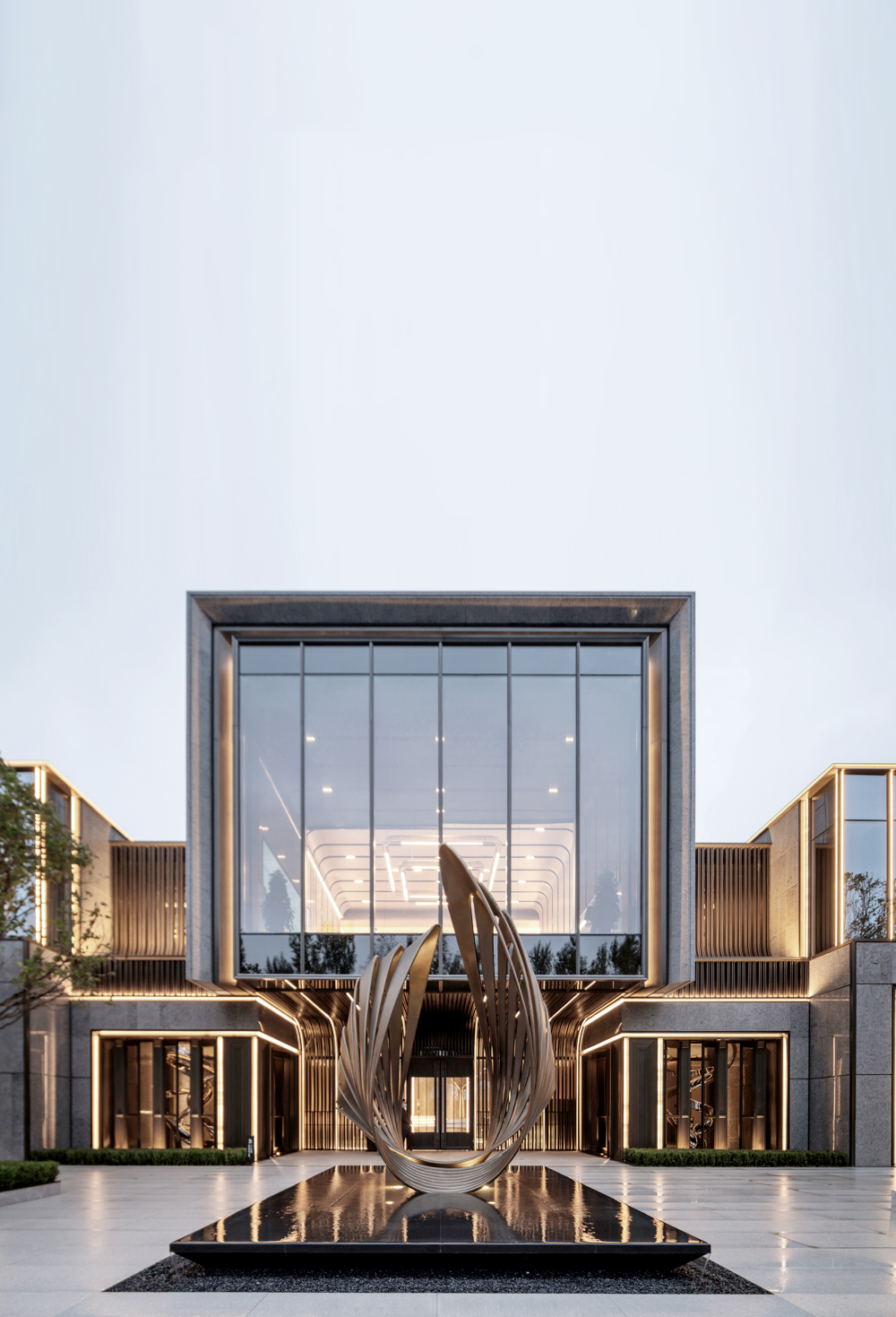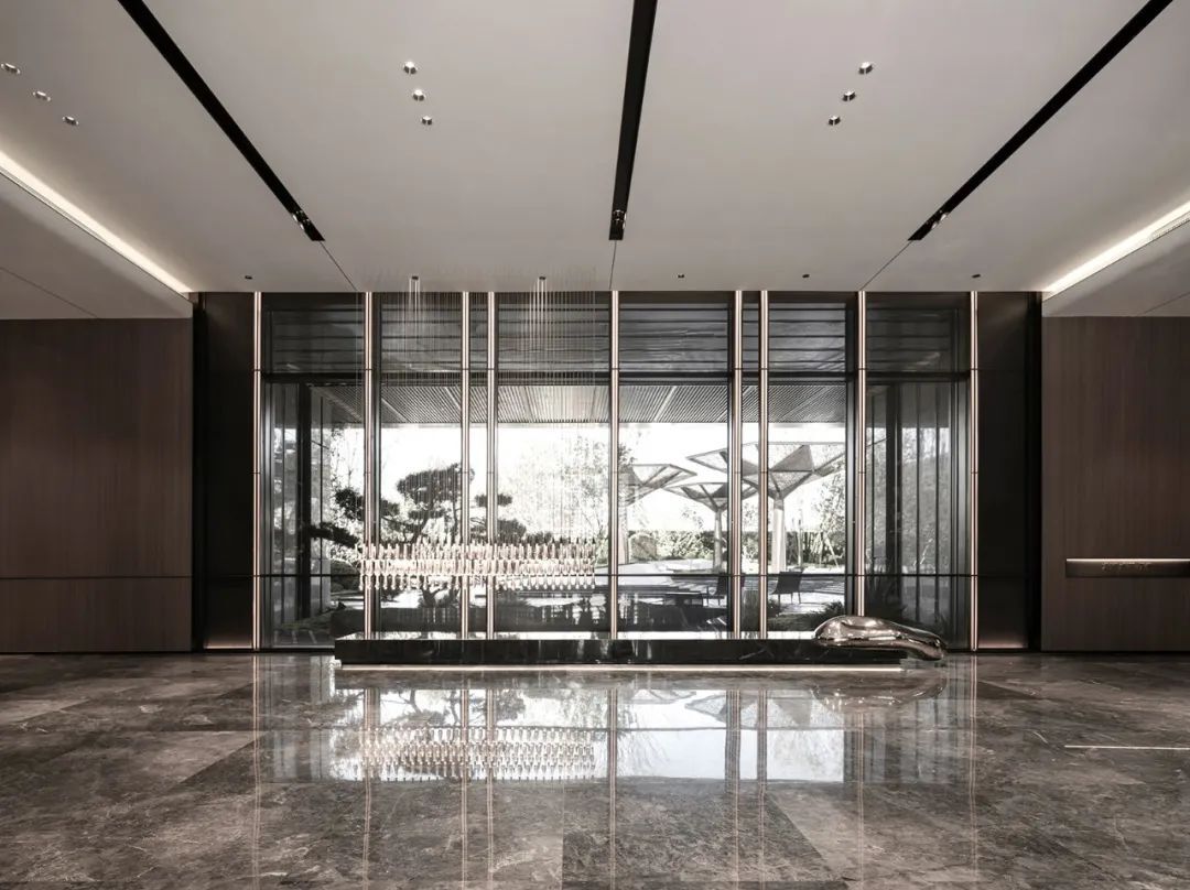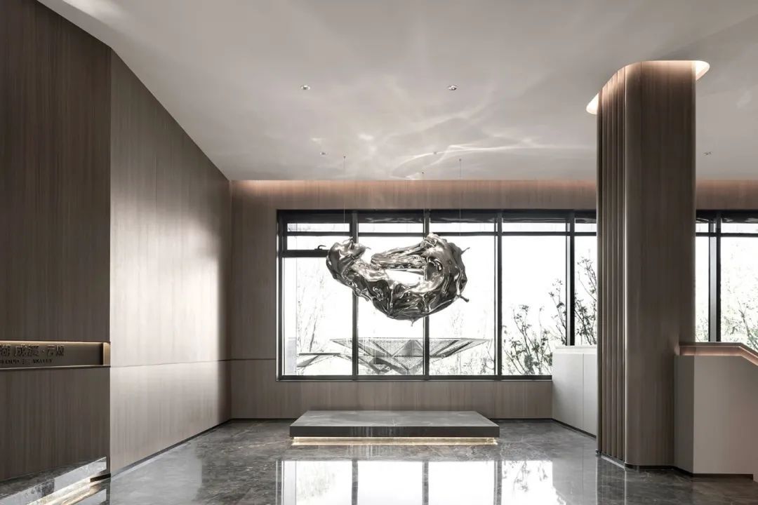 一入大厅,映入眼帘的是石材台面上空宛若水滴阵列而成的组合吊灯,宛如海面划开一道道涟漪,绵延的浪花与侧面的水滴雕塑相互追逐,使整个空间熠熠生辉,别有一番生趣。