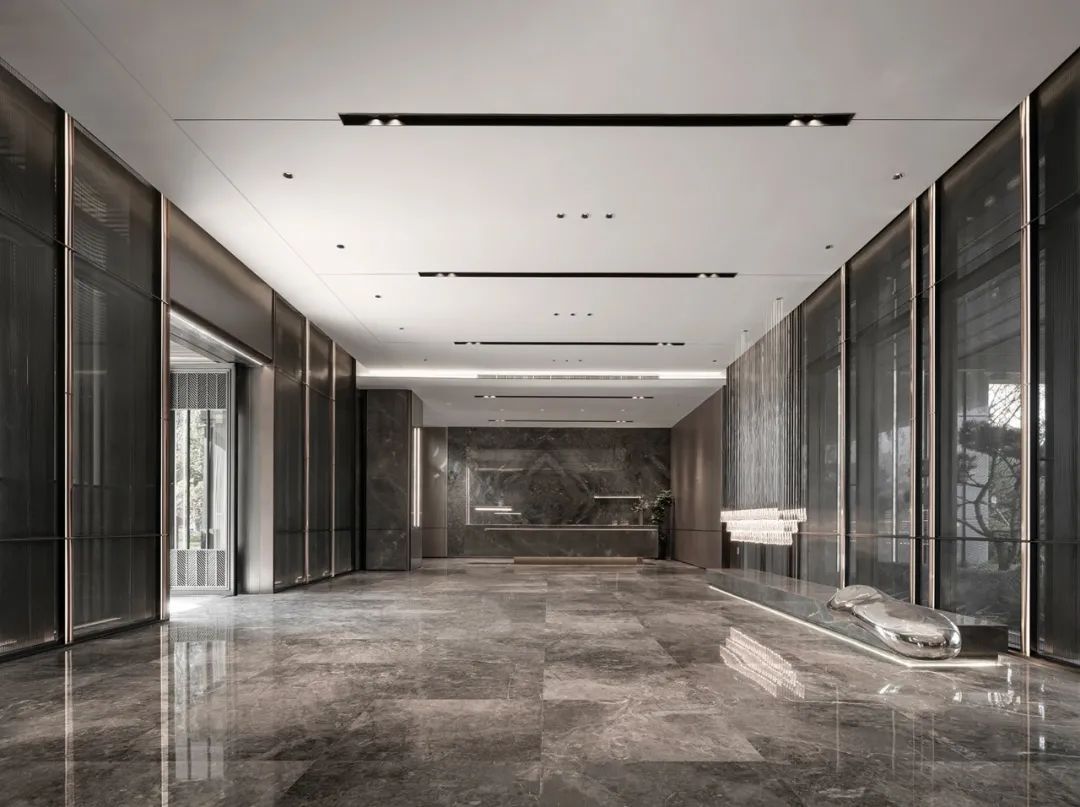 The landscape pool wall below the north staircase is embedded with alternating acrylic light strips. The ground is made of mirrored stainless steel material, which extends the visual depth and breadth of the space and emphasizes the transparency of the space. At the same time, the acrylic light strips also echo it, cleverly creating a ethereal reflection in the mirrored stainless steel, creating a rich sense of hierarchy for the space.