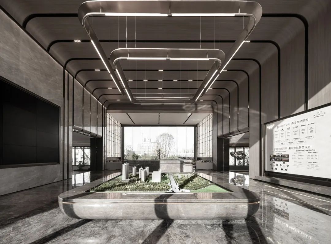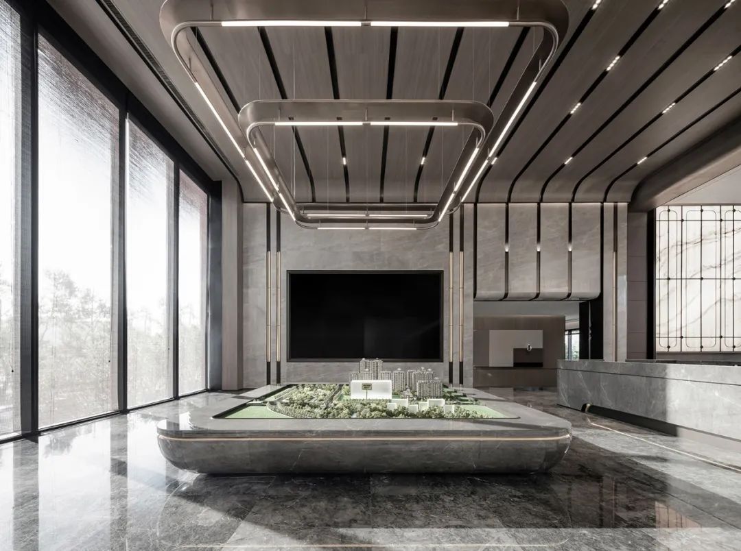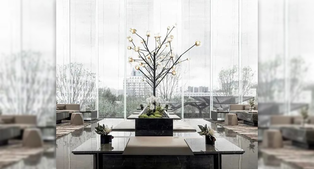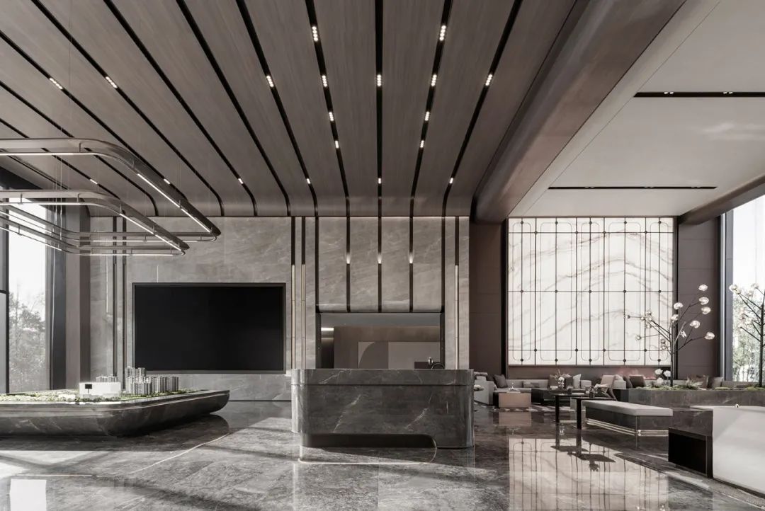 The background wall of the reception desk on the south side creates a minimalist atmosphere with geometric elements deconstructed and reorganized blocks. The collision of metal, wood veneer, and dark stone creates a combination of hardness and softness, exuding a modern luxury hotel style.