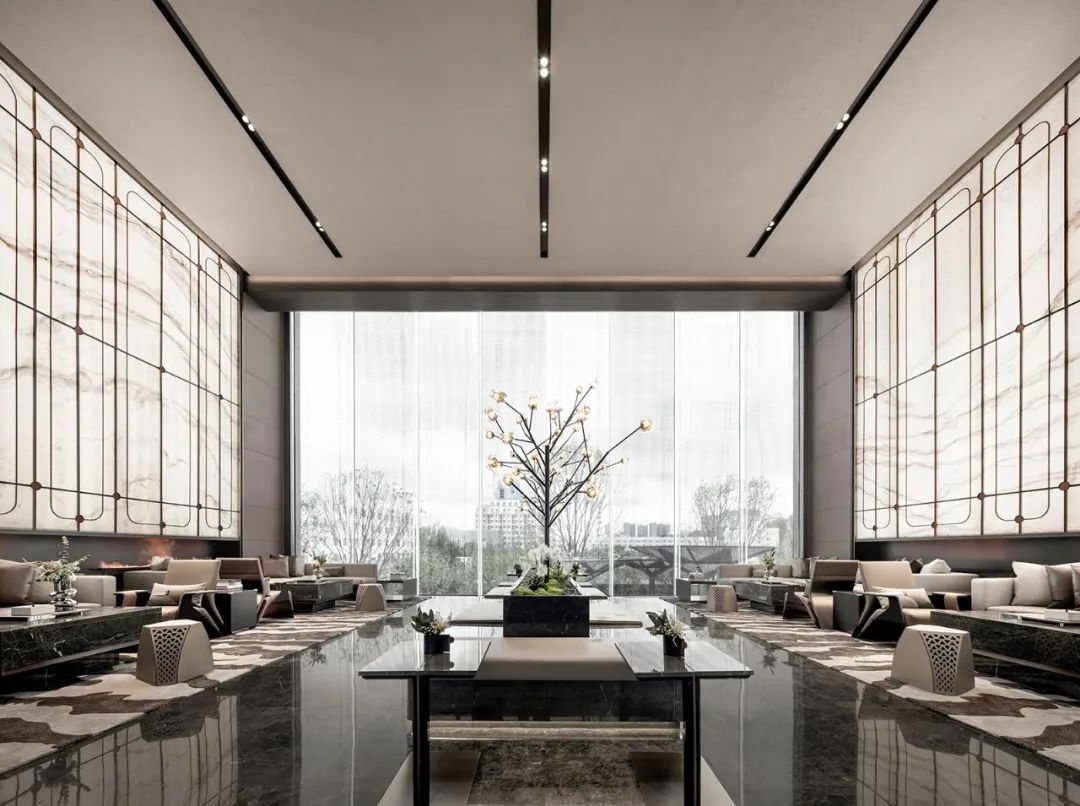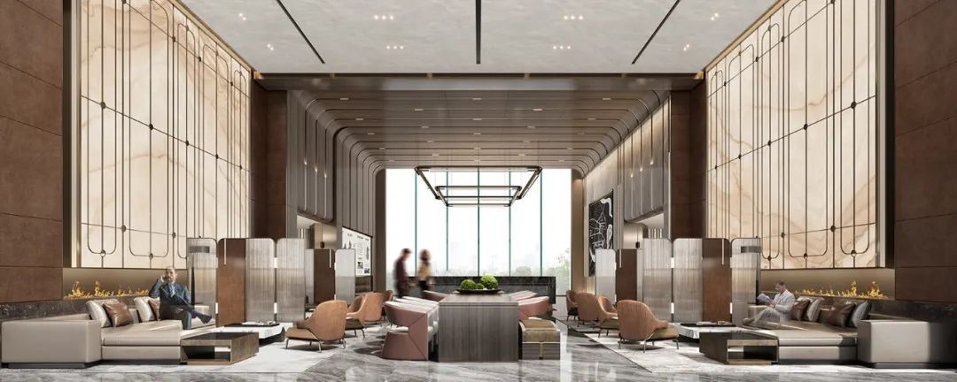 南侧接待台背景墙以几何元素的解构与重组的体块营造简约的氛围,金属、木饰面、深色石材的碰撞,刚柔并济,极具现代奢华酒店风。