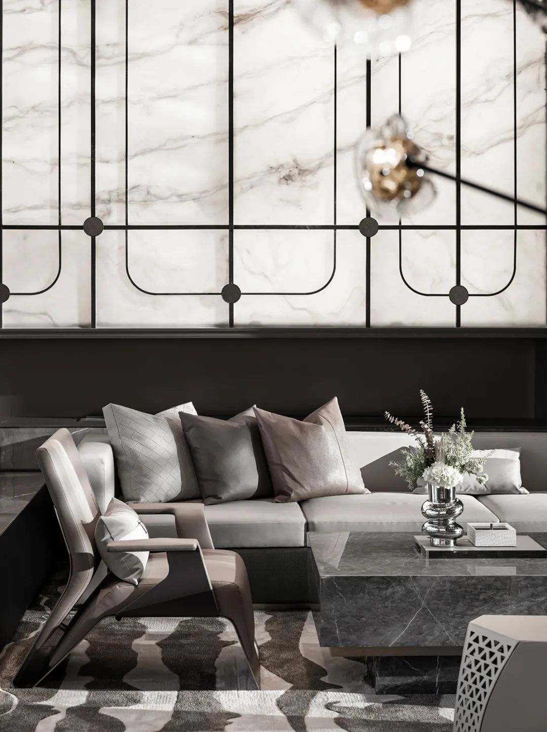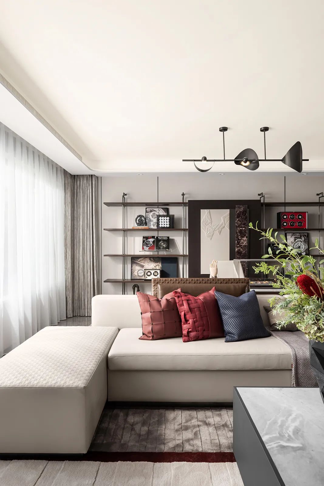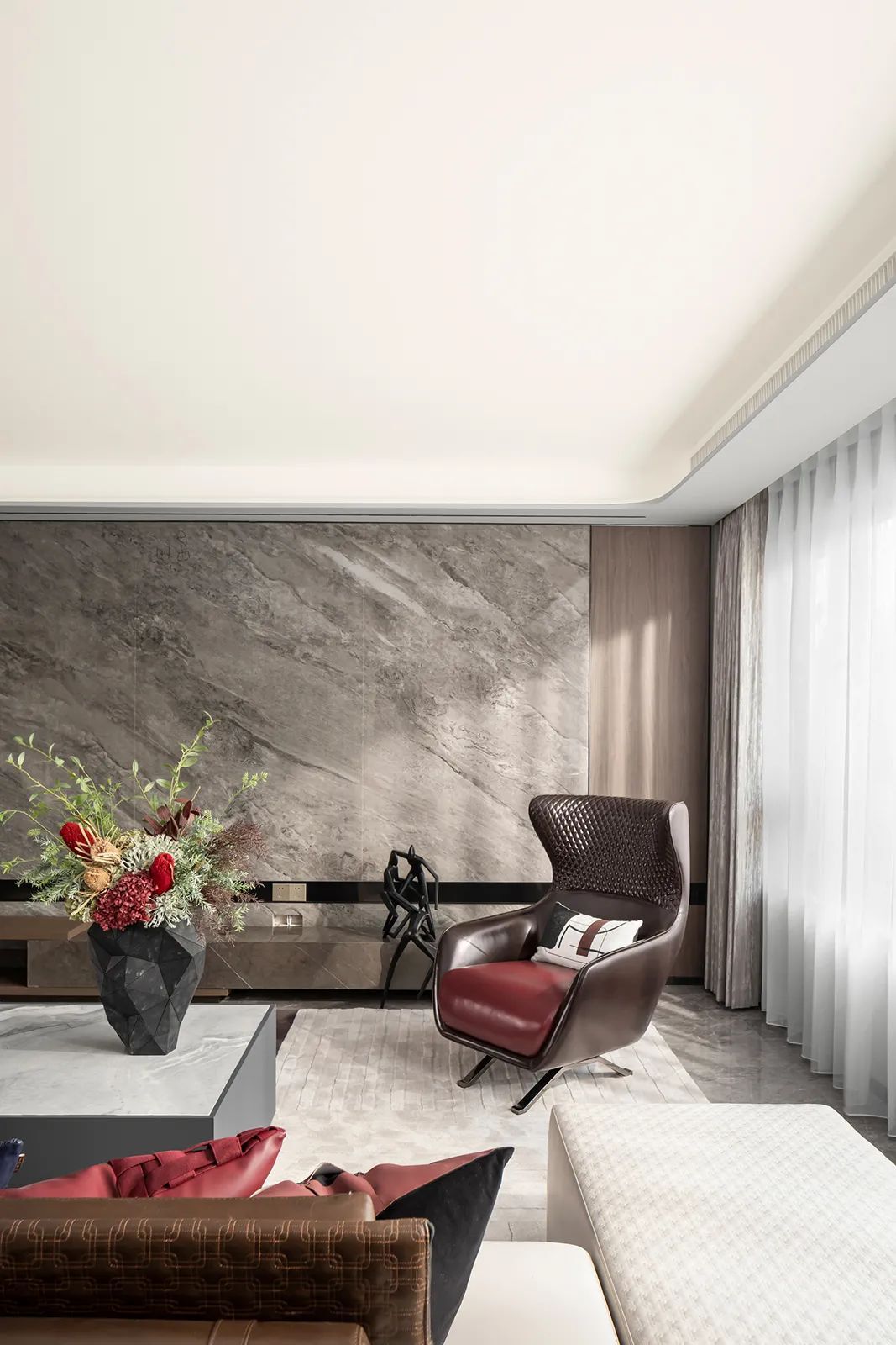 在大理石与米白色铺陈的空间里,随处可见的勃艮第红化形为地毯上的拼接色块,沙发上的抱枕,辅以咖色平衡空间气质,更为沉静大气。