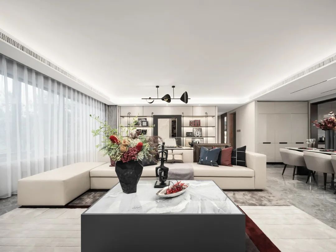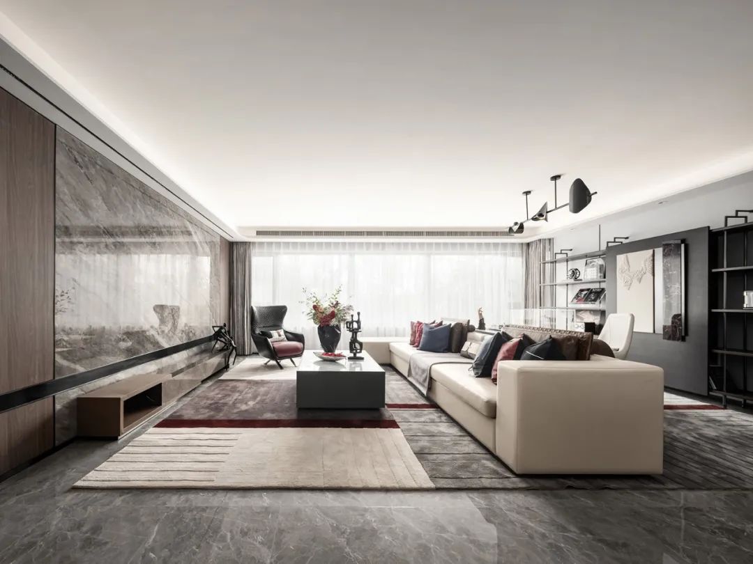In the space paved with marble and off white, Burgundy redness can be seen everywhere as patchwork color blocks on the carpet, and the pillows on the sofa are complemented by coffee color to balance the space temperament, making it more calm and atmospheric.
