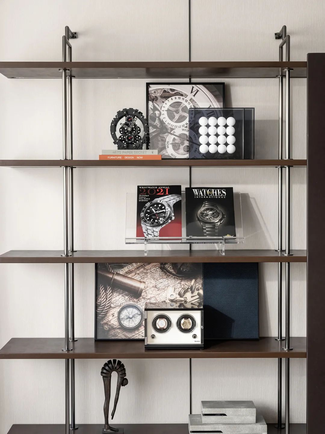 “文学”是心灵的“避风港”。客厅书房演绎出一个兼具美学与实用性的空间,金属与原木相搭配的置物架是贯穿此处“天地”的灵魂点缀,是既时尚又奢华的格调体现。