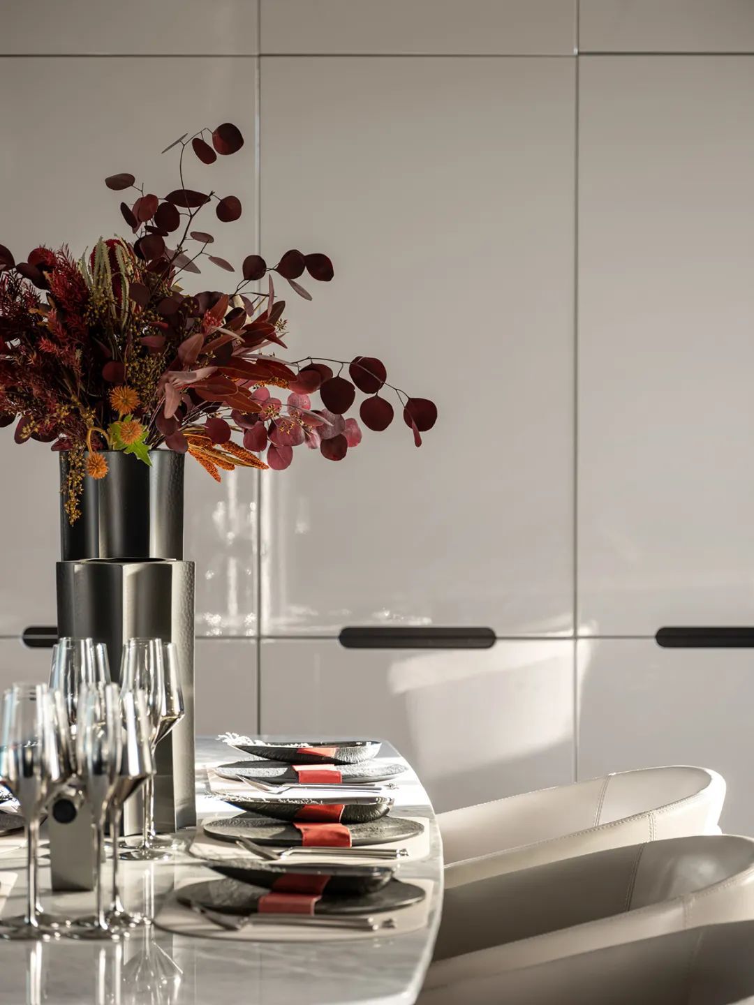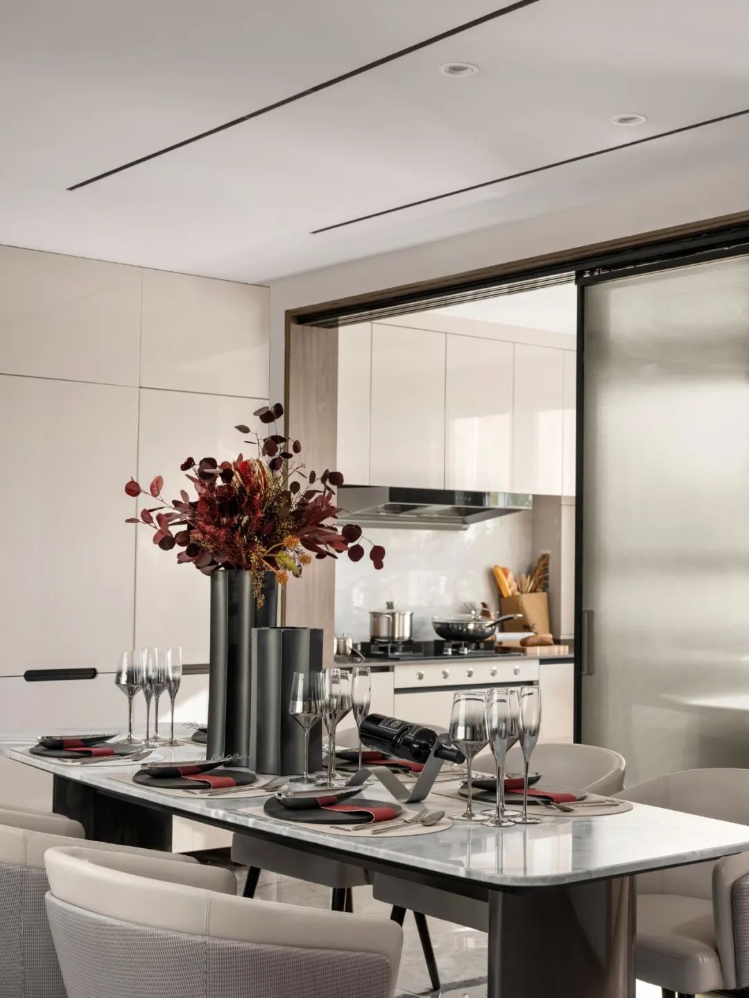 客餐一体的格局打破了空间视觉上的平静,以一种延伸的姿态衔接用餐时刻。明亮奢侈的色彩搭配让餐厅看起来尤为现代摩登,无主灯设计兼具美学内涵,堆叠氛围,带来与众不同的别致美感。餐桌上井然有序地放置着精致餐具,浪漫的红色花卉与餐具上的勃艮第红丝带遥相呼应,与家人好友共享美食,倒上一杯红酒,畅谈生活里的小确幸。