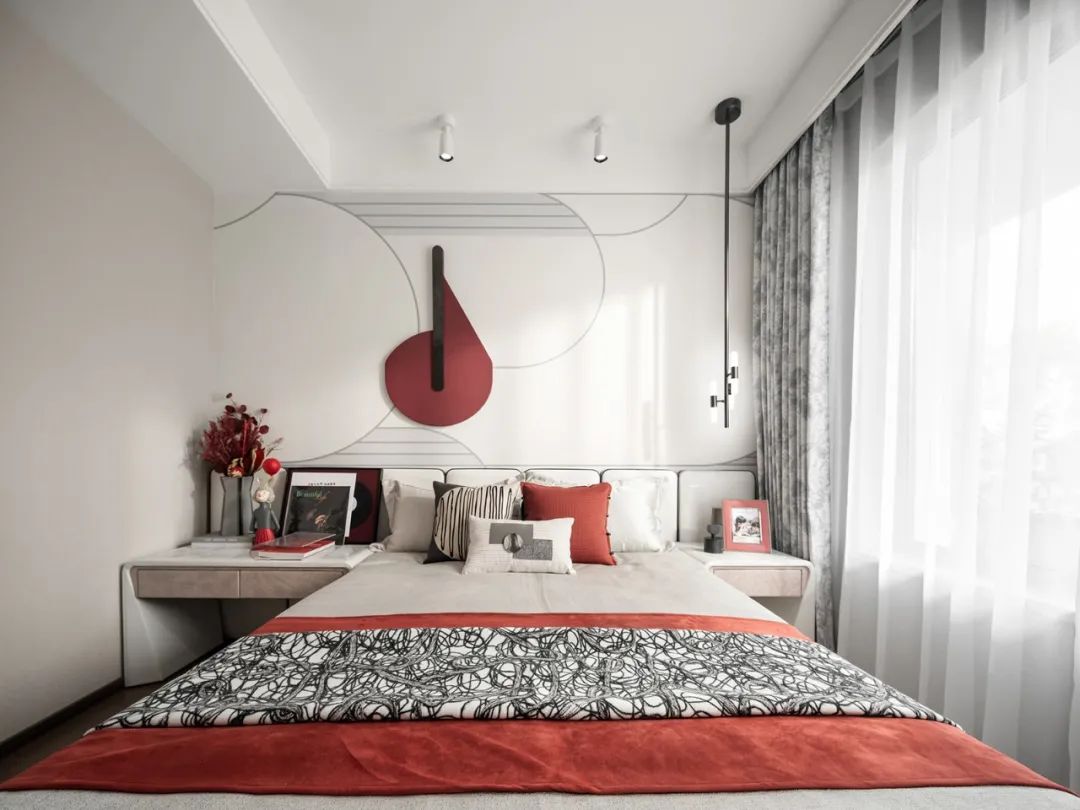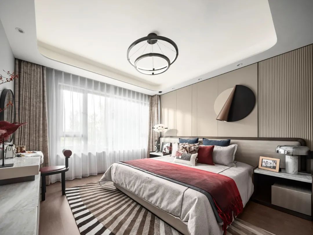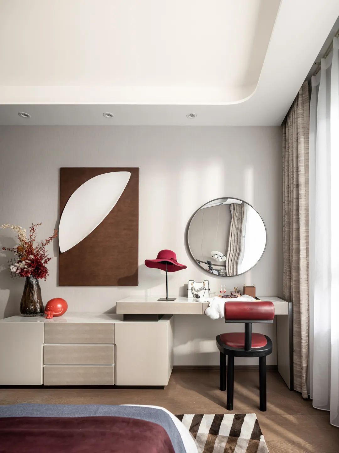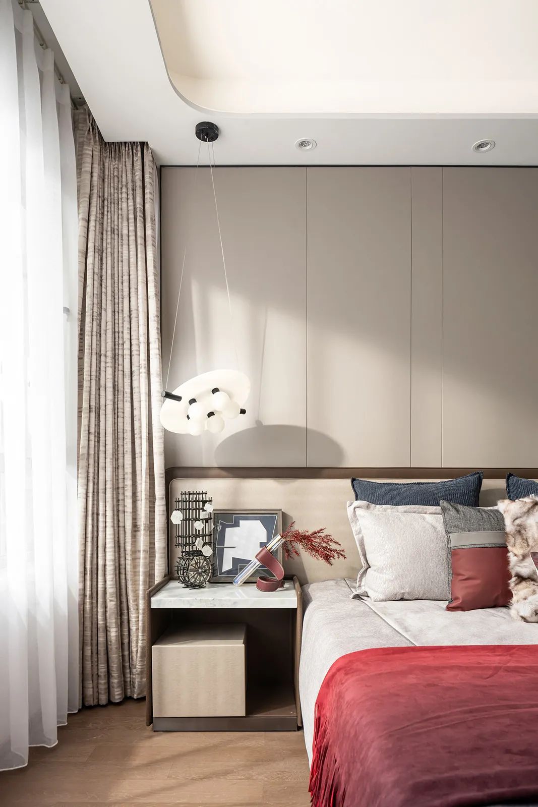 The master bedroom is warm but not hot, extracting the beauty of everything and pouring it into it. The earth color and Burgundy red cover the skin, and the fabric, fur and chamois bring the beauty of complexity and meaningfulness. The Khaki background is selected on the bedside, and a pendant with a sense of luxury is hung, which adds a touch of petty bourgeoisie to the elegant space; The metal lighting fixtures are extremely exquisite and pleasing to the eyes and emotions.