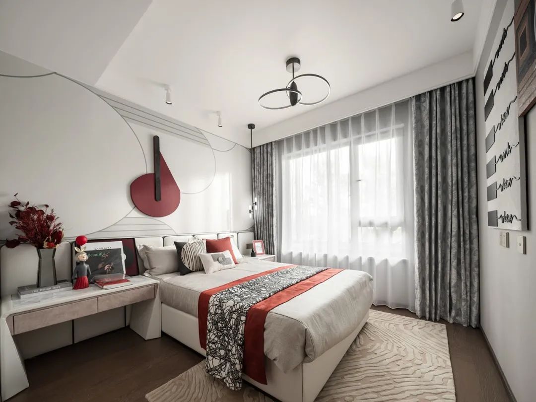 The girl's room is inspired by "music" in its design, and the note decoration on the bedside wall and the staff wall painting blend with Burgundy red, as if playing an passionate piece of music; The bedding and curtains have messy yet aesthetically pleasing line designs, with a unique sense of cleverness that enlivens the entire space.