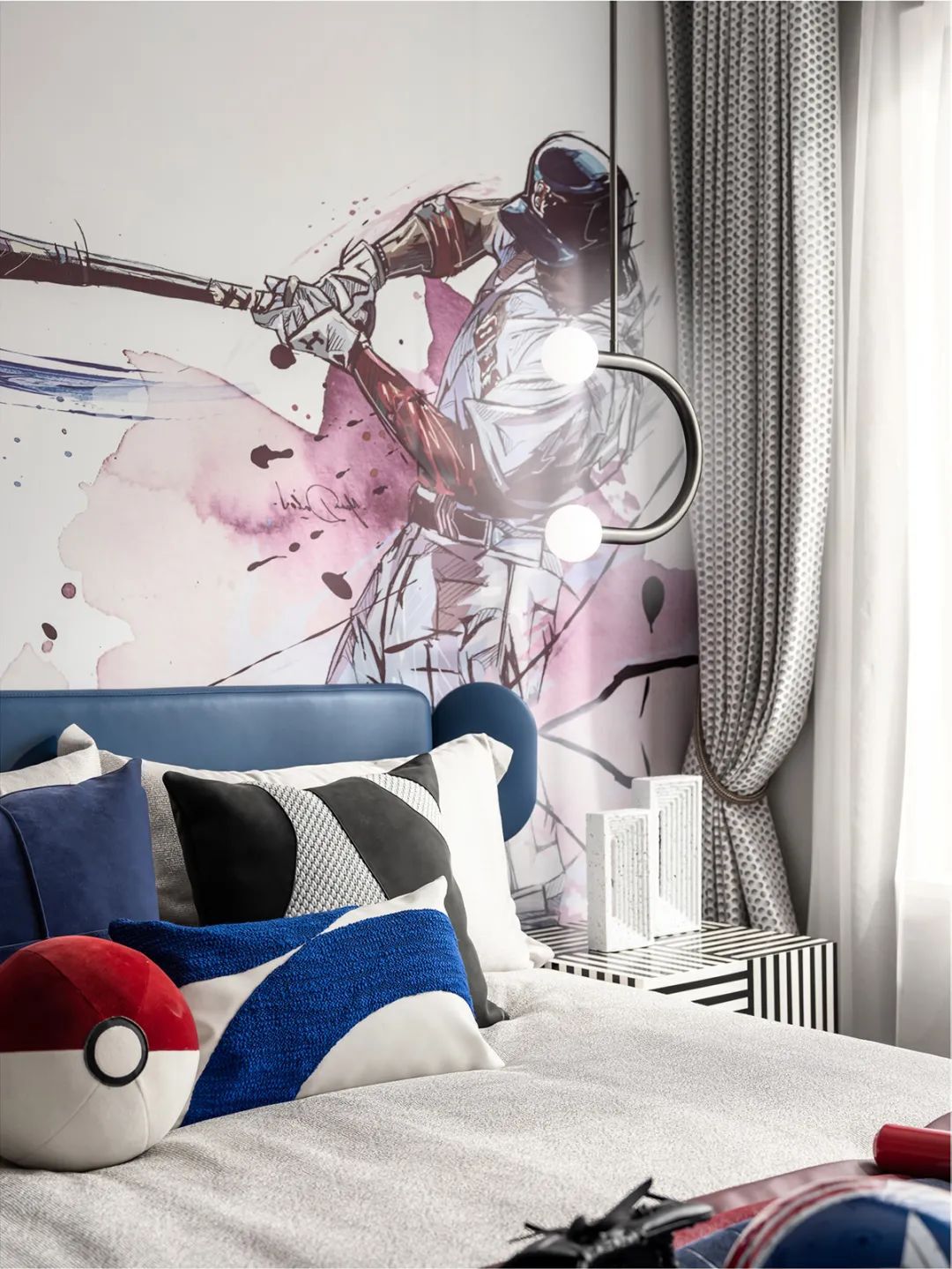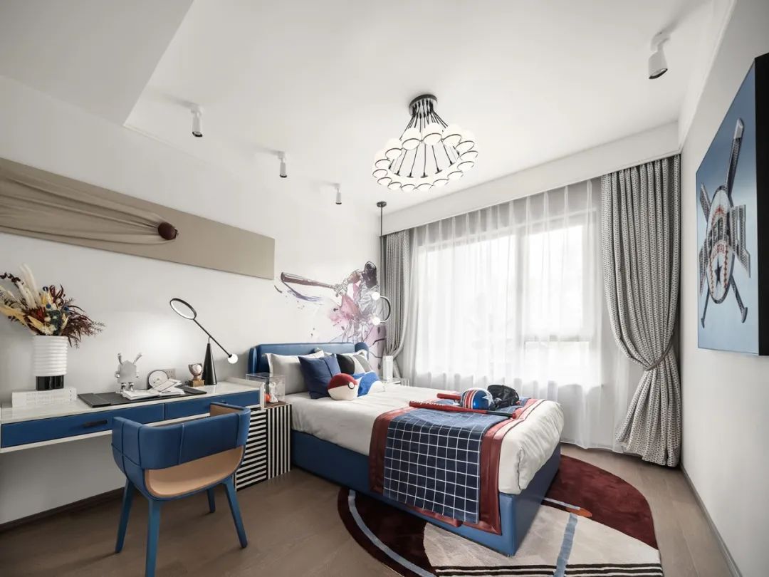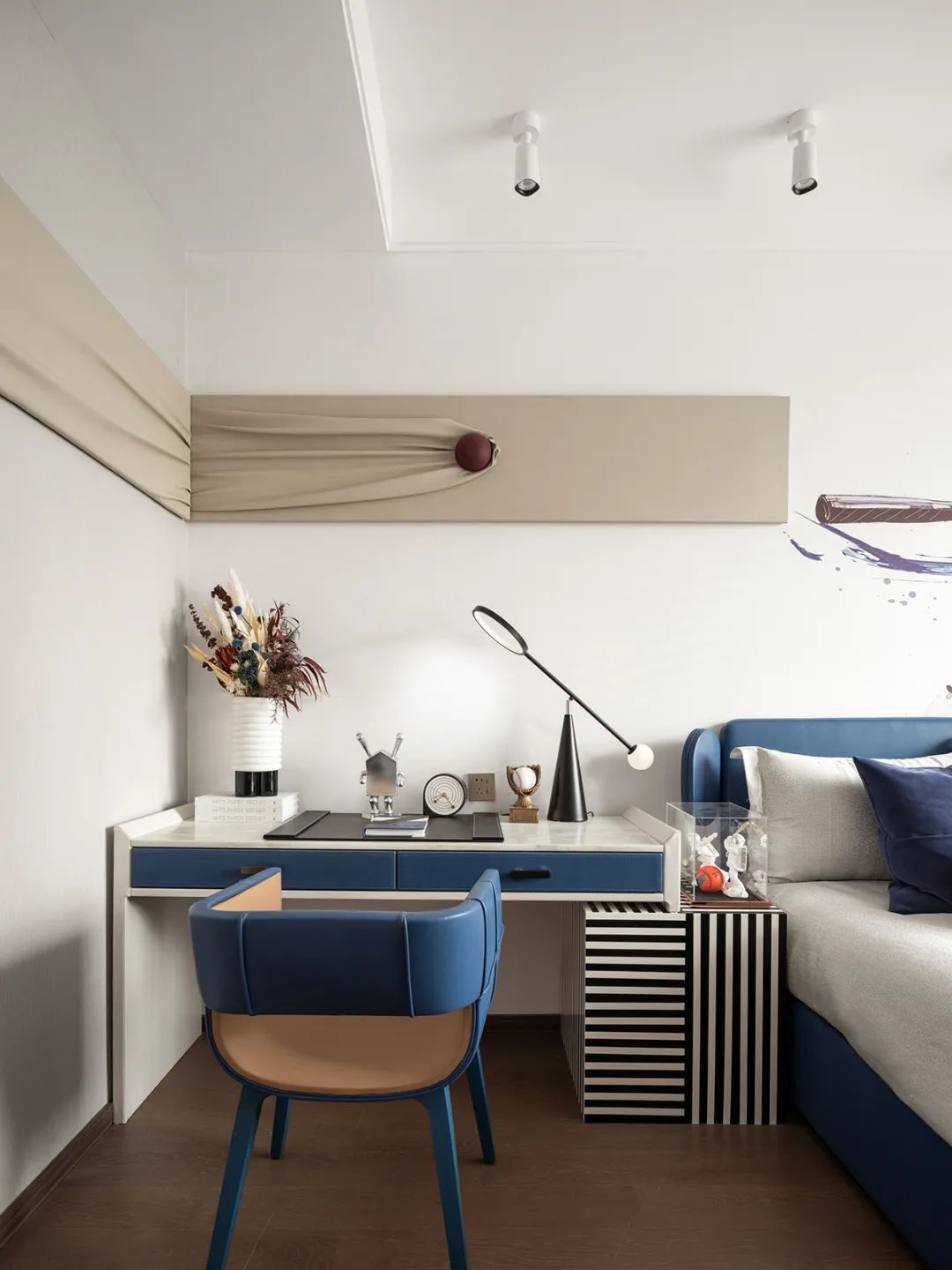 男孩房选用动漫“宝可梦”里的经典“蓝红”配色,高级又不失律动,棒球元素彰显男孩的活泼;室内搭配书桌,可以满足孩子学习与阅读的需求,动静皆宜。