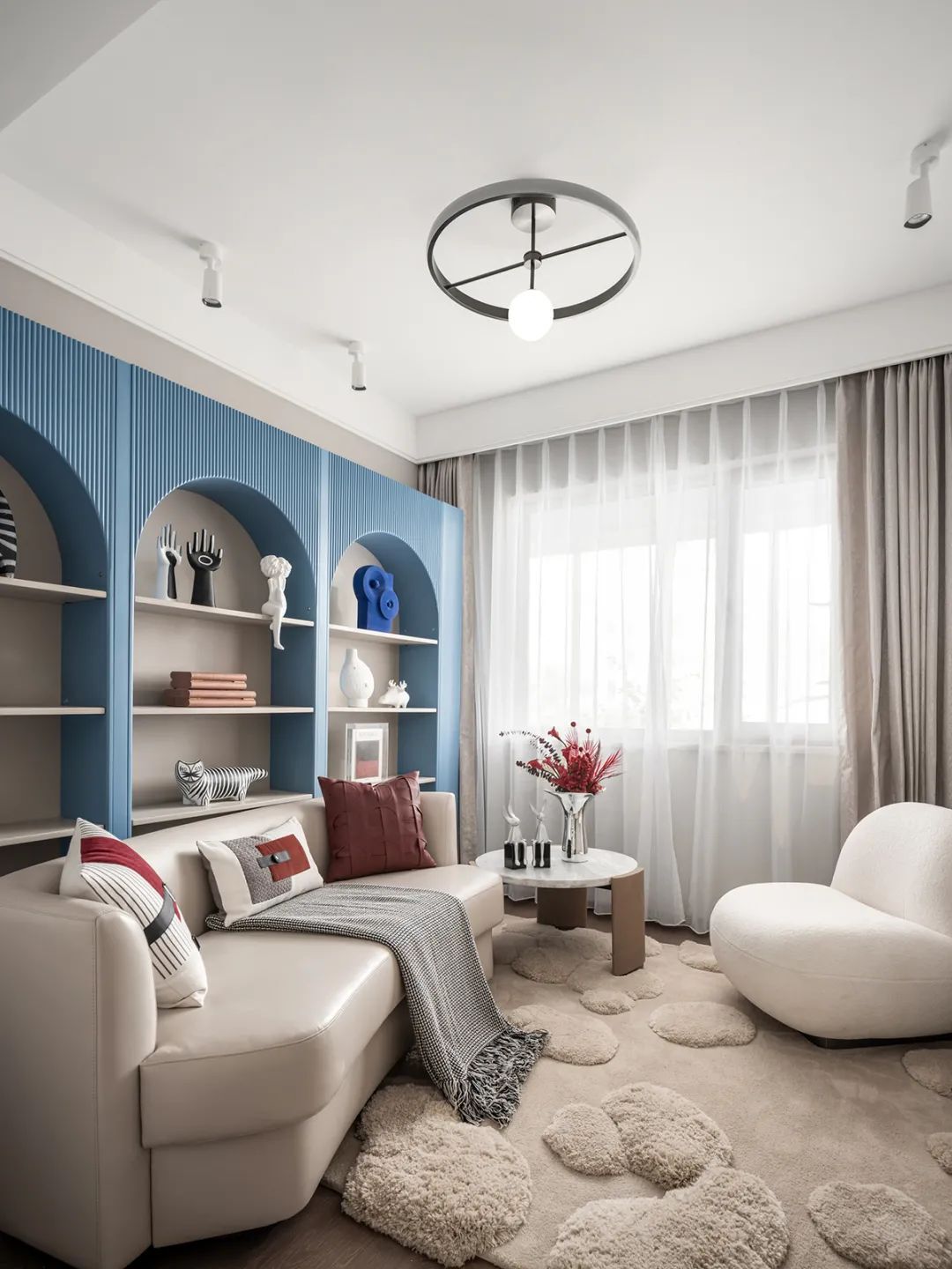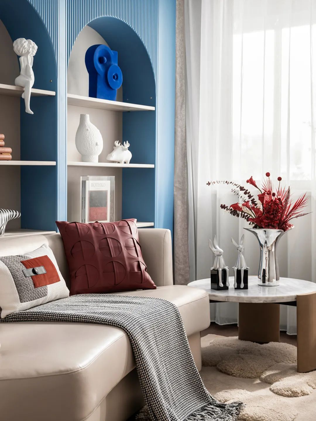 As a space for entertainment and leisure, the family room is full of Elements of art, artistic sculptures and murals, which inject an artistic atmosphere into the space. The warm leather sofa and soft tactile carpet present a rich sense of layering, while the low saturation space main color expresses a peaceful spatial temperament, complemented by details of Burgundy red and Klein blue, which are particularly fashionable and light up the enthusiasm in life.