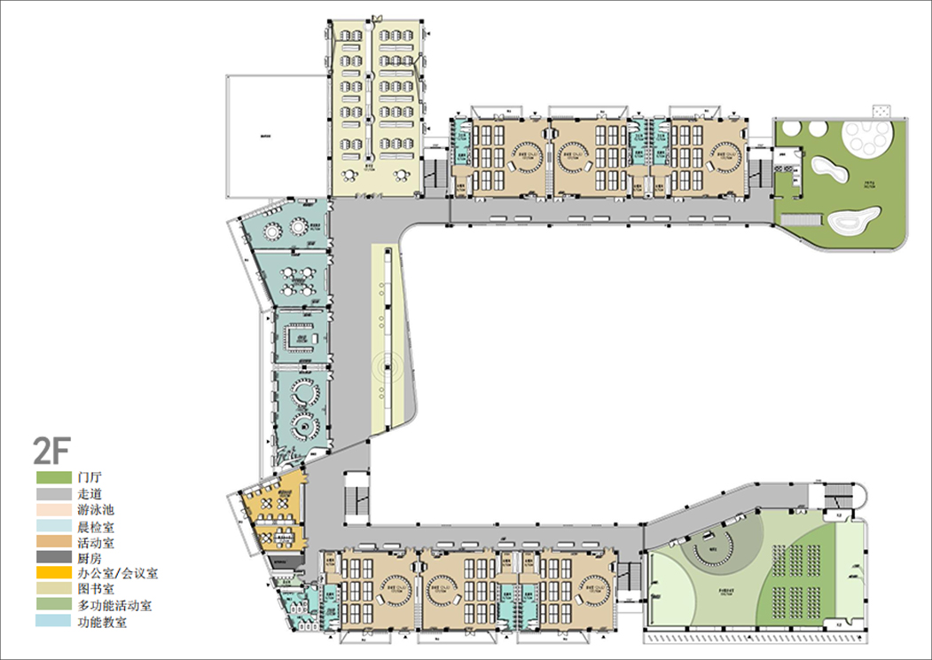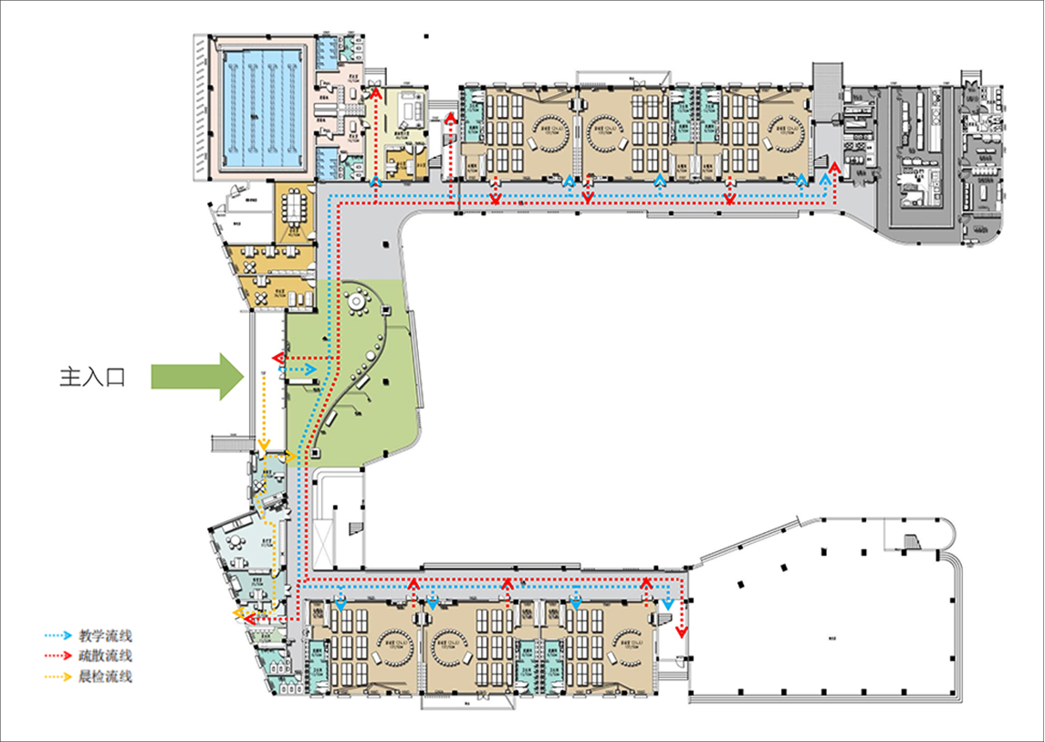 4. 考虑晨检室、隔离间要与整个教学流线做到不交叉,设置独立安全出口,营造良好的教学空间。