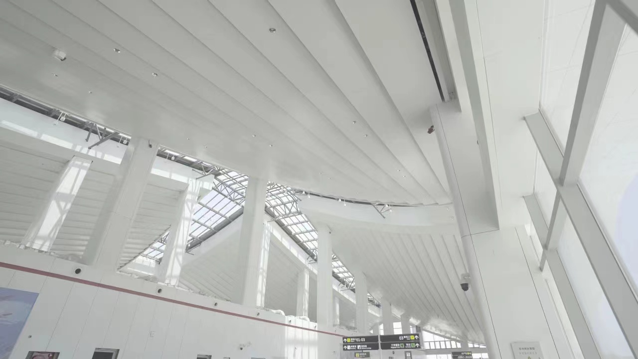 The special-shaped ceiling of the indoor large space is symmally arranged by the "cross" skylight as the axis. Through the special universal joint component and double keel to convert the deflection, the 1832 aluminum alloy strips are laminated to form a hyperbolic shape, like a "staff", showing the elegant and flexible beauty. The project adopts the inverted roof method and the composite waterproof system of new coating + waterproof coil laying + insulation layer laying can effectively improve the waterproof material, service life and waterproof effect. The smooth and smooth slope of the terminal roof also provides favorable conditions for drainage.