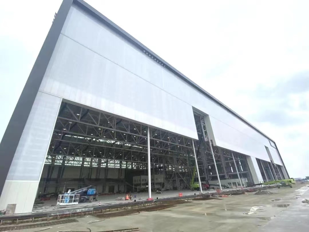 There are two sets of MRO hangar gates, each with a net width of about 84 meters and a net height of about 26 meters, which belong to the largest vertical lifting flexible stacking doors in China. At present, there is no mature construction experience in China. The project adopts the construction technology of ultra-large hangar flexible stacking doors. The reasonable overall force of the hangar gate ensures the smooth construction of the hangar gate.