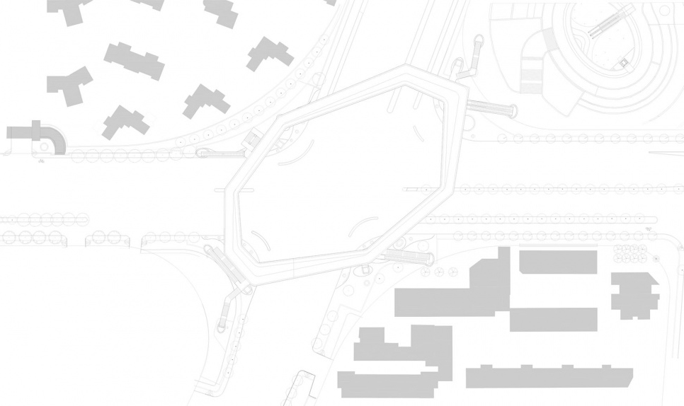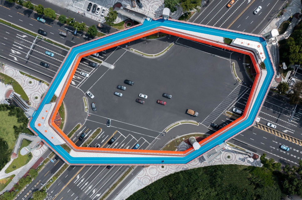 To create a spacious area for residents to linger and enjoy the view, the bridge deck is widened in the northeast and southwest quadrants, resulting in an expanding deck towards these two diagonals. In the enlarged areas at the northeast and southwest corners, linear sections are extracted and elevated to create two different-sized wing-shaped sunshades.