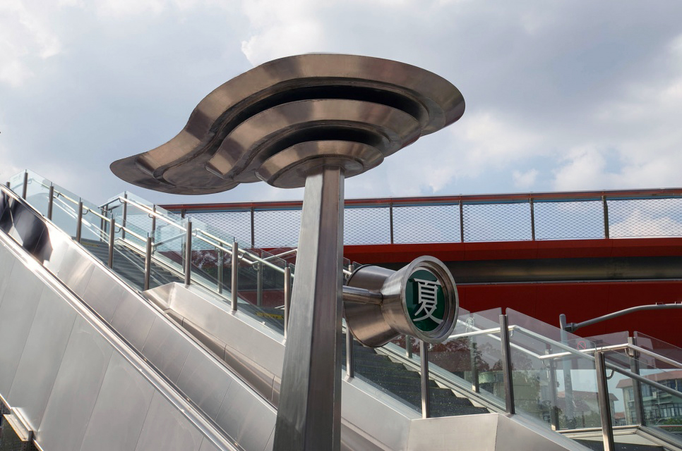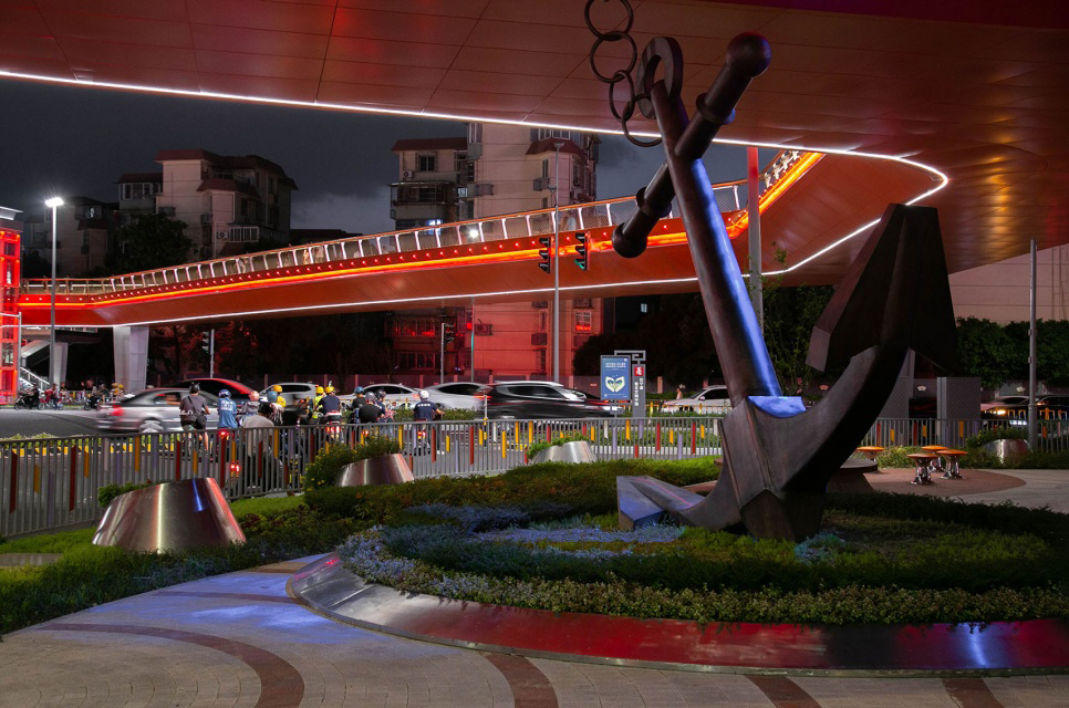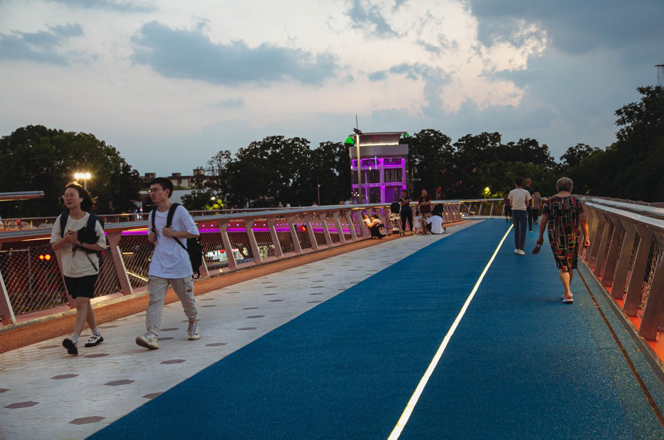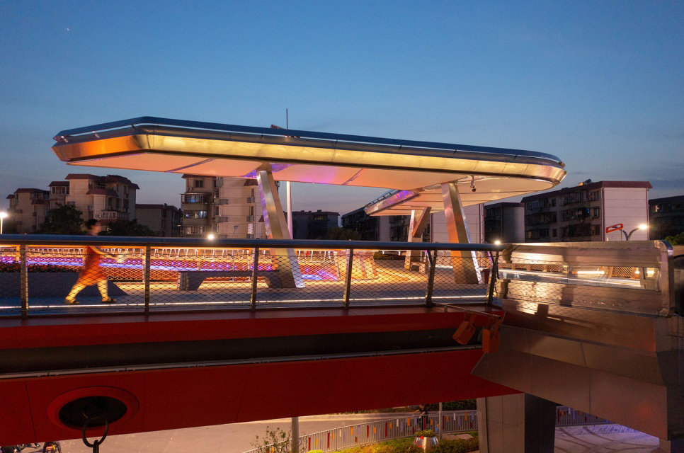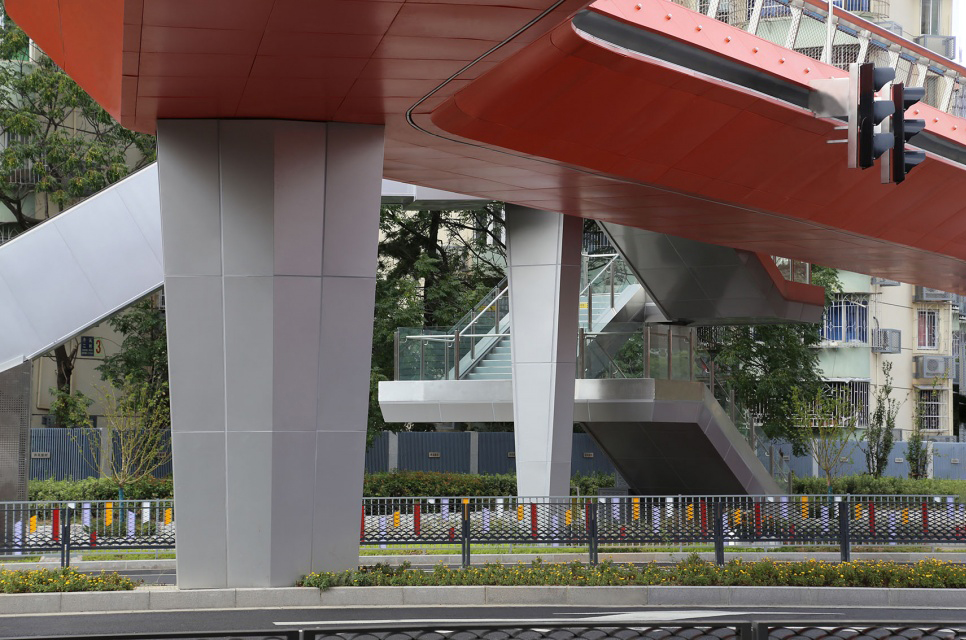 The hexagonal cross-section is also repeated on the bridge piers, where the sharp geometric shapes contrast with the bridge’s graceful curves. The silver-gray and orange-red surfaces clearly delineate the structural relationship, all in an effort to create the visual illusion of the suspended pedestrian overpass. To alleviate the visual weight caused by the thickness of the box girder, metal gaps are cut on both the inside and outside, reducing the mass and also considering landscape lighting.
