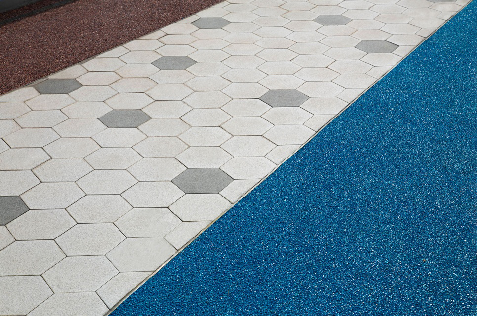 The bridge deck is paved with non-slip colored adhesive stone and hexagonal granite tiles. The combination of vermilion and lake blue adhesive stone emphasizes vitality and athleticism, while the hexagonal tiles complement the polygonal layout of the bridge.