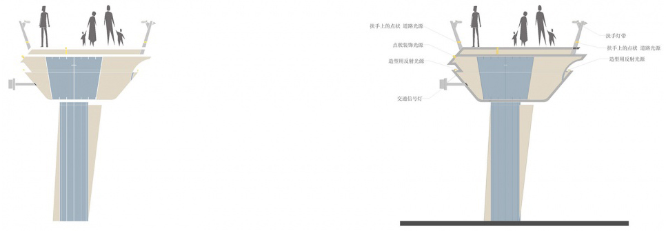 六边形截面同样在桥墩上重复,锋利的几何状与桥体的婉转、银灰色与橙红色的表面将构造关系清晰的分离,这样做的目的依然是为了营造天桥悬浮的视觉感。为了消解天桥因箱梁厚度带来的立面厚重感,在内外两侧均切开一道金属缝隙,消解体量,这也是为亮化景观的考虑。