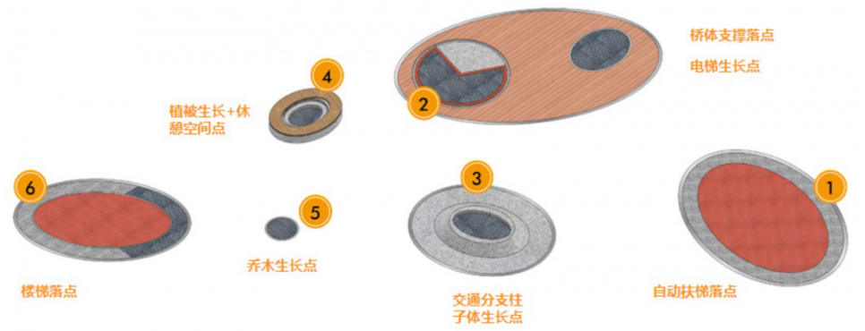 为拓展出宽阔的活动空间供市民停留、观景,于是将东北、西南两个象限的桥面拓宽,得到一个向这两个对角逐渐放大的桥面,在东北、西南角的放大区域,线型截取、抬升得到两个大小不一的飞翼状的遮阳亭。