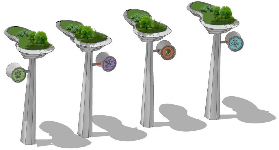 对于夜晚的景观照明设计,我们遵循形式服从功能的原则,光源设置完全从实用角度出发,根据交通设施的特点,对出发点、通行道路、停留面进行“点、线、面”的对应设计。所有装饰性照明采用 RGB 光源,以分钟为单位循环七种光彩。