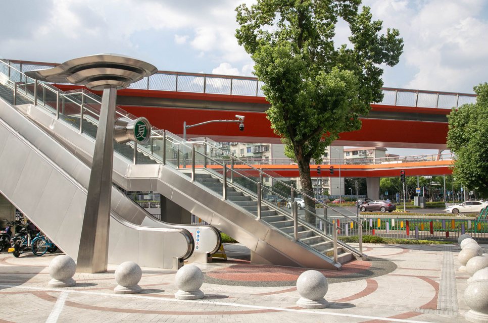 The main bridge has a total length of approxiately 293 meters and is equipped with 4 pedestrian staircases, 5 escalators, and 4 vertical elevators to improve the pedestrian system and achieve barrier-free access. There are a total of 8 bridge piers, and the clearance under the bridge is 5.5 meters.
