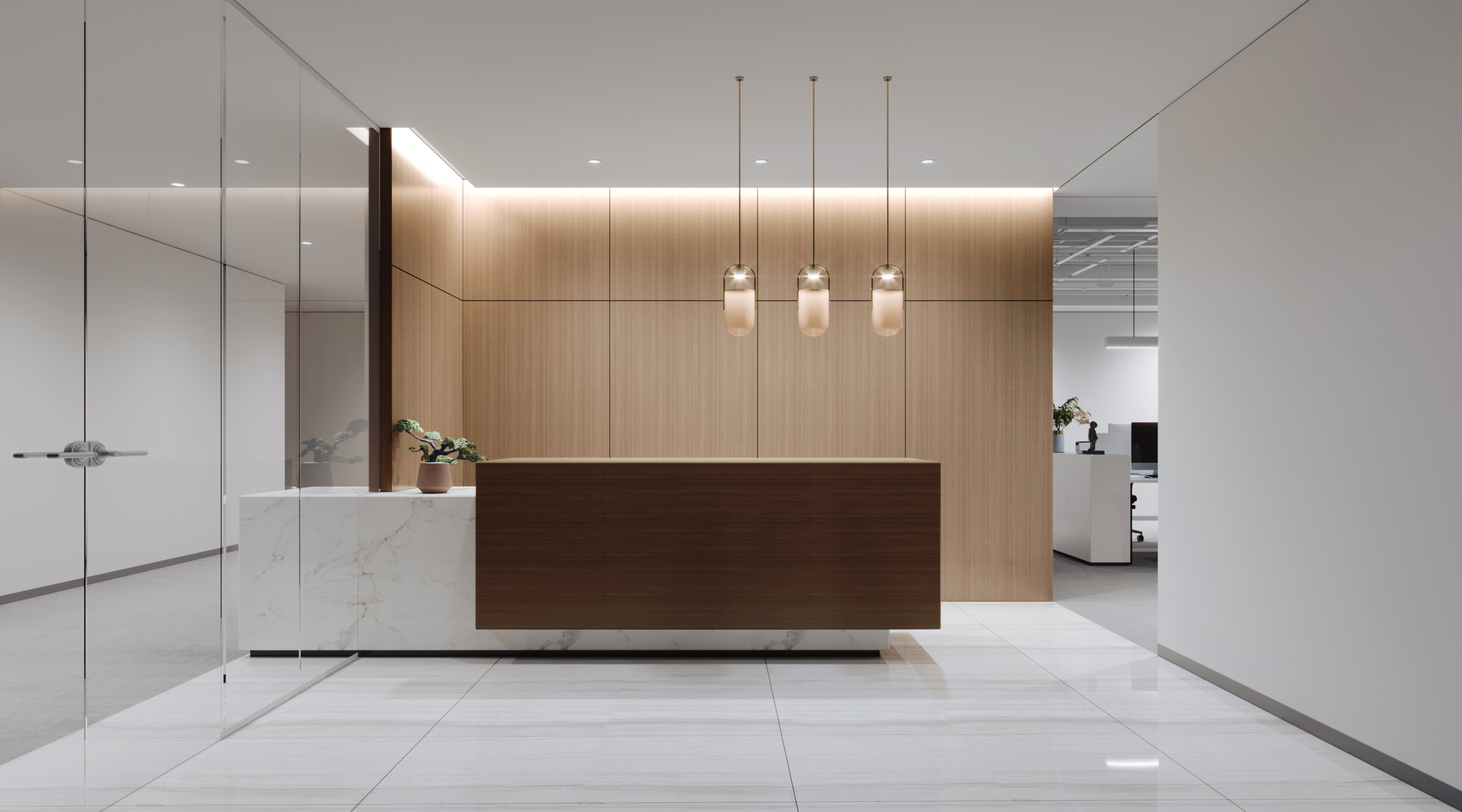 整体空间基调:庄重典雅、简洁、高品质,展现企业的核心文化理念,肩负着特殊使命,不失传统文化的延续,在空间布置中融入了国际化前沿的办公理念,在统一与变化中有机融合,体现当代美学思想,视觉和谐、功能和谐。简约高品质。