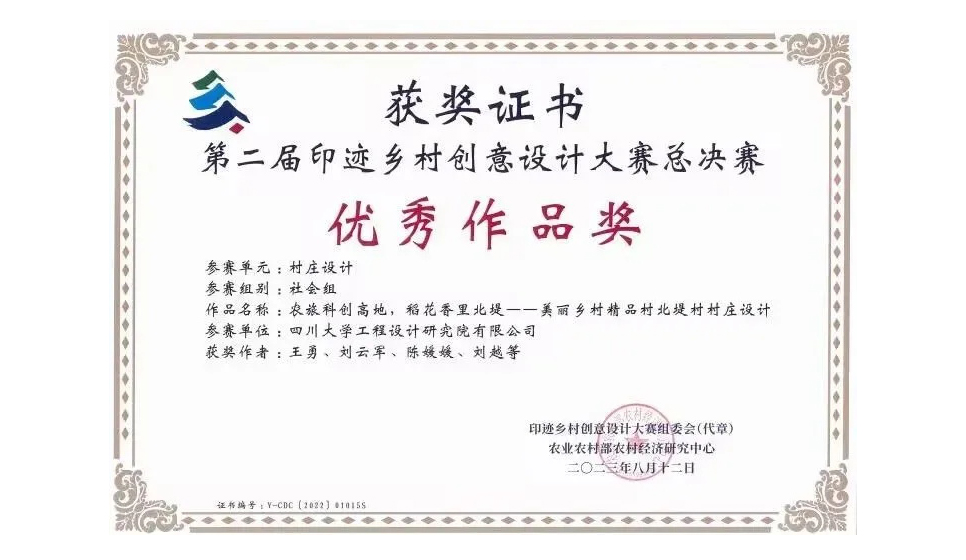 2022年9月,我院《农旅科创高地,稻花香里北堤——美丽乡村精品村北堤村村庄设计》参加了农业农村部农村经济研究中心等单位举办的第二届印迹乡村创意设计大赛,全国各省赛区分别对参赛作品进行评比,我院作品荣获河南省赛区三等奖并入围全国总决赛,在第二届印迹乡村创意设计大赛总决赛中斩获优秀作品奖。