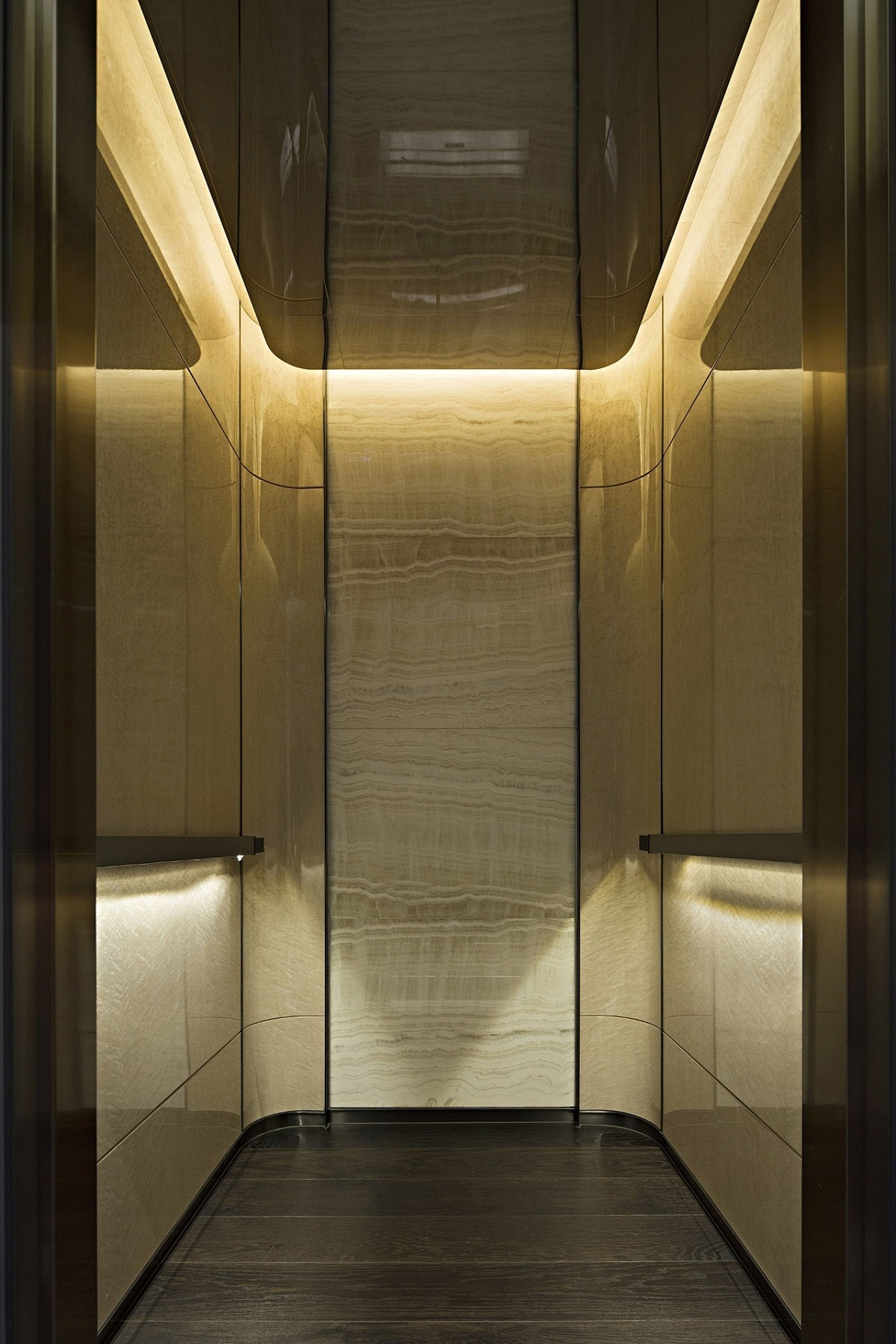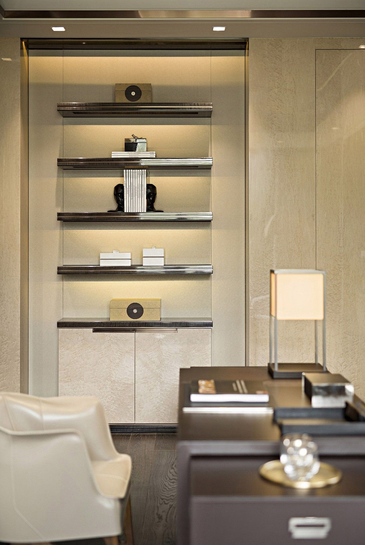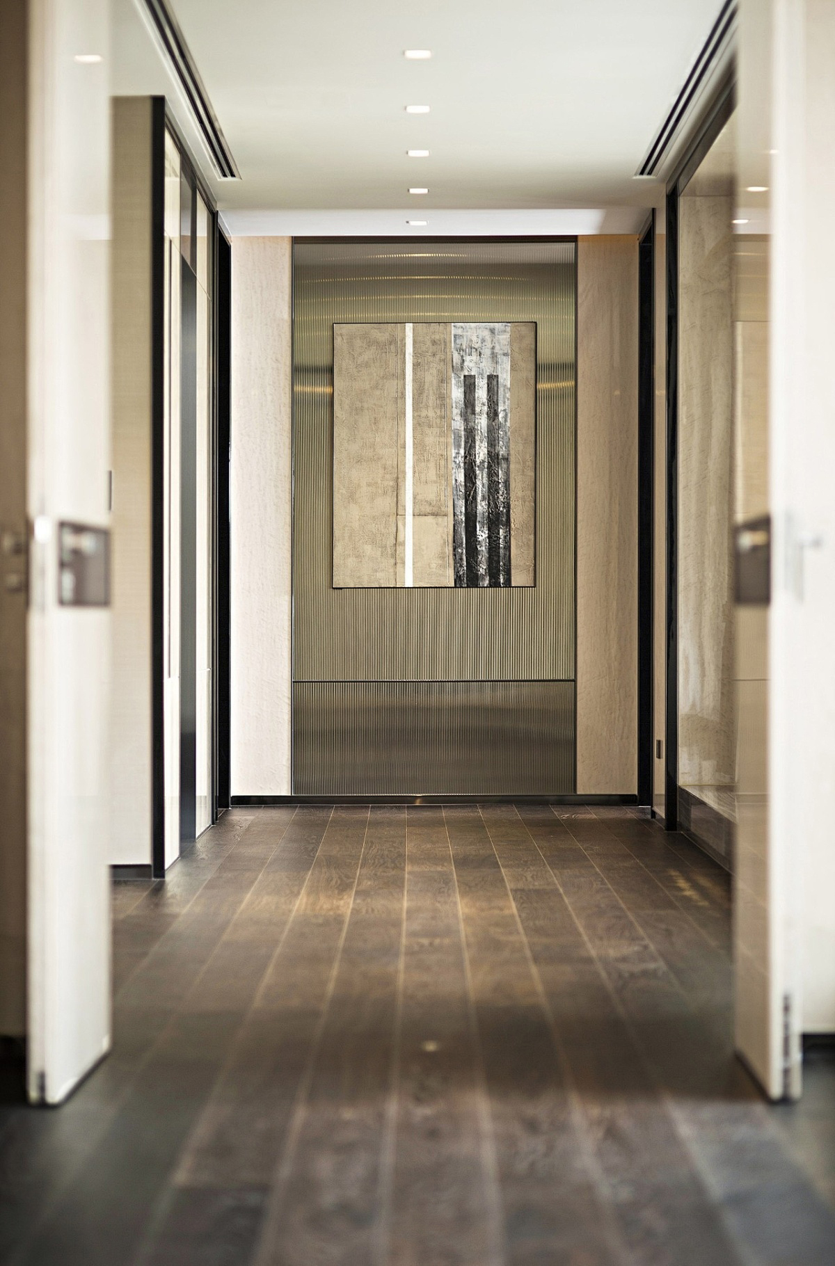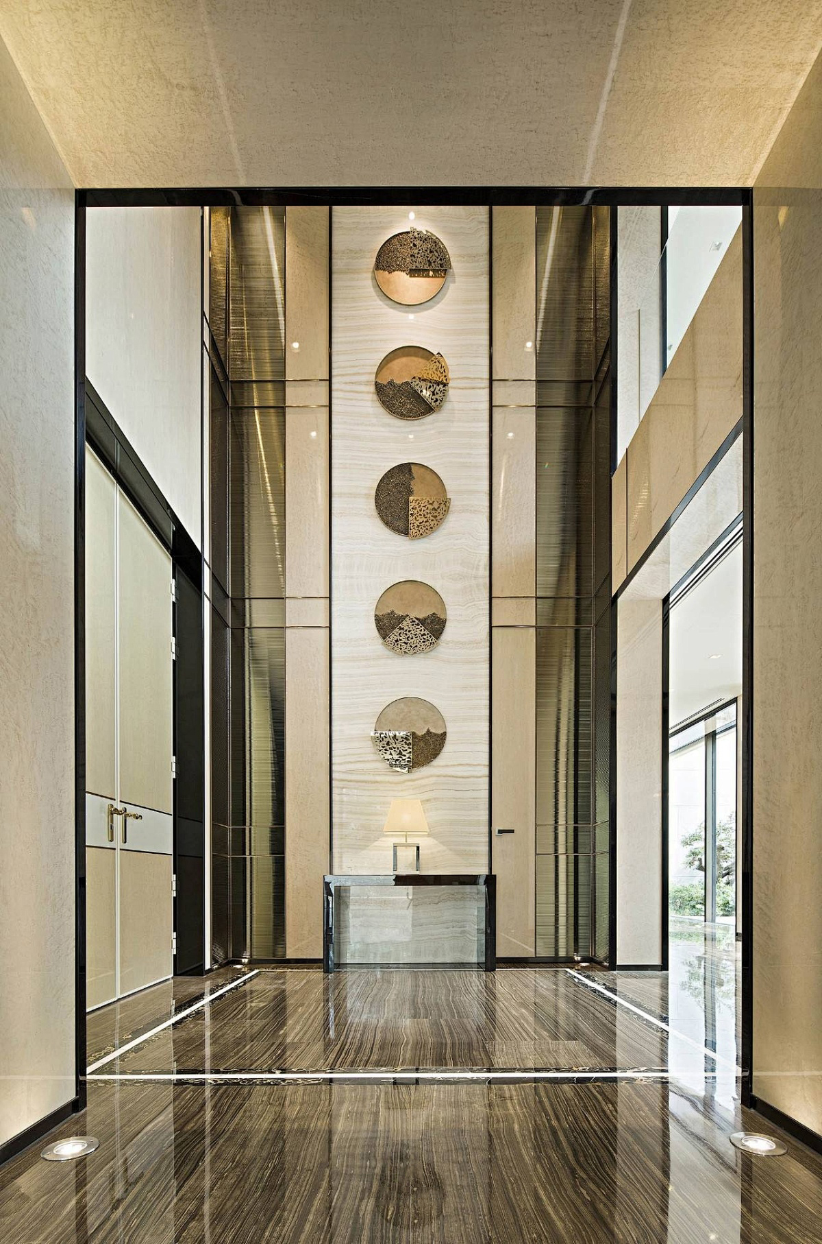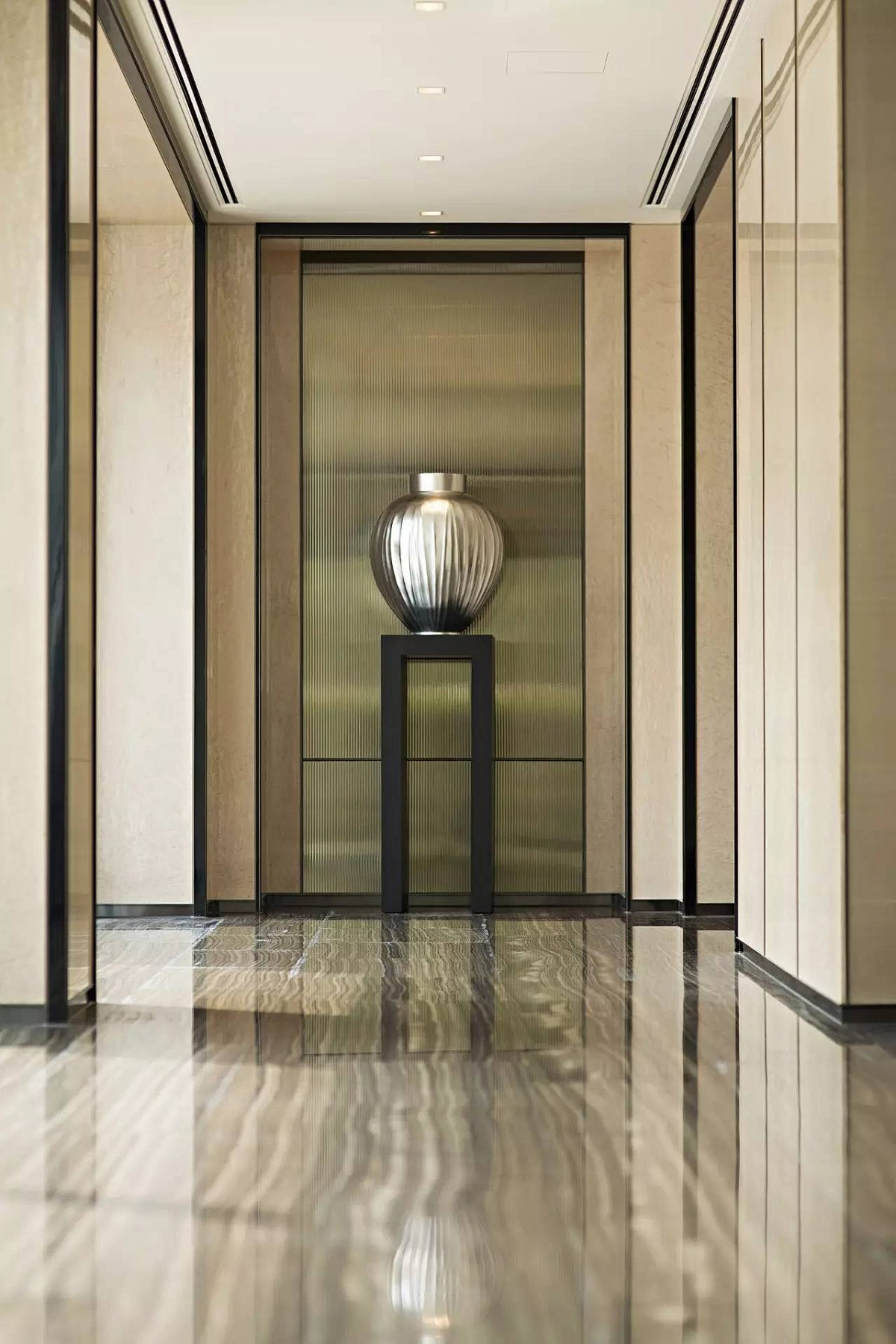 精致的工艺与触感,在细节中流露矜贵奢华的气派。扪布及亮光木饰面墙身,缀以古铜拉丝不锈钢踢脚线,增加空间的立体感,时尚高雅。