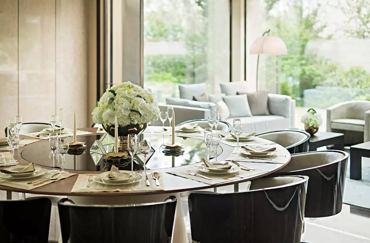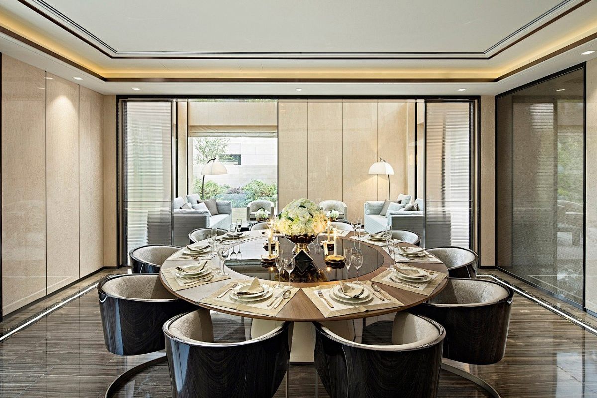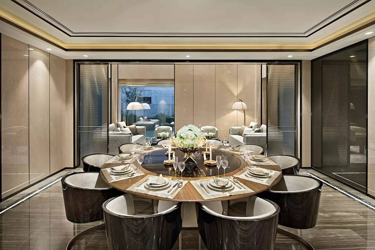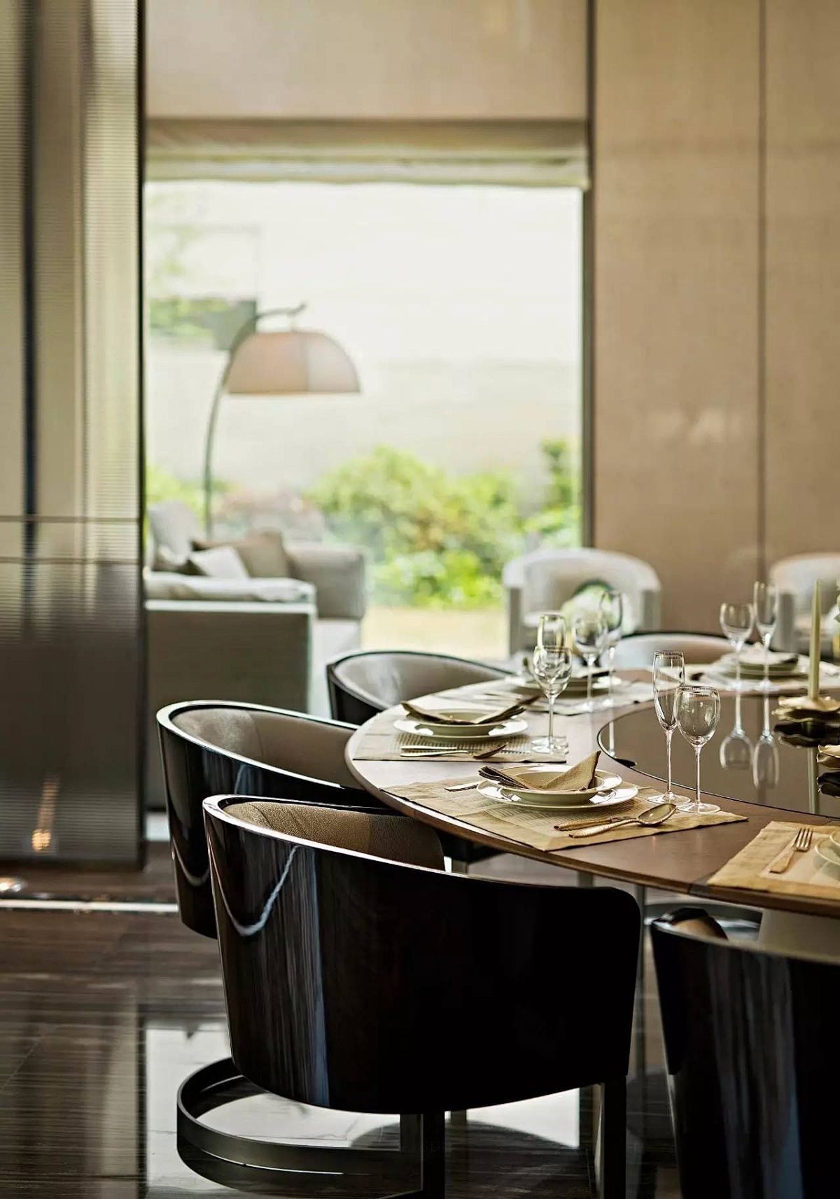 The adjacent restaurant continues the delicate style of the living room, with a circular dining table for ten people in the center, paired with black curved leather dining chairs both inside and outside, exuding a low-key and luxurious fashion atmosphere.