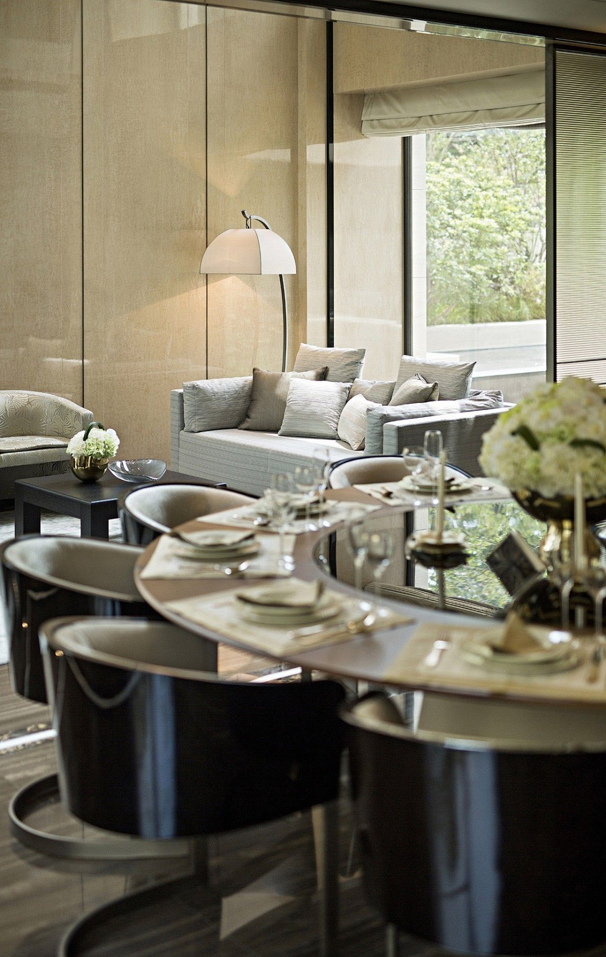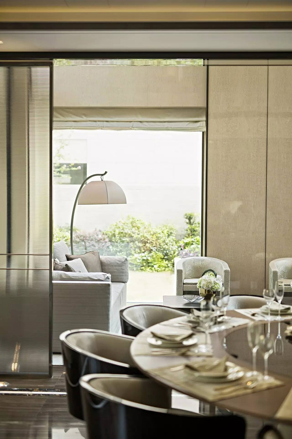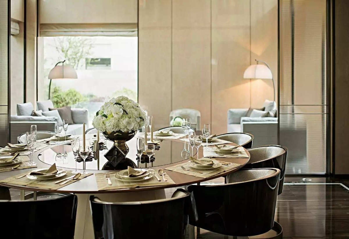 The adjacent restaurant continues the delicate style of the living room, with a circular dining table for ten people in the center, paired with black curved leather dining chairs both inside and outside, exuding a low-key and luxurious fashion atmosphere.