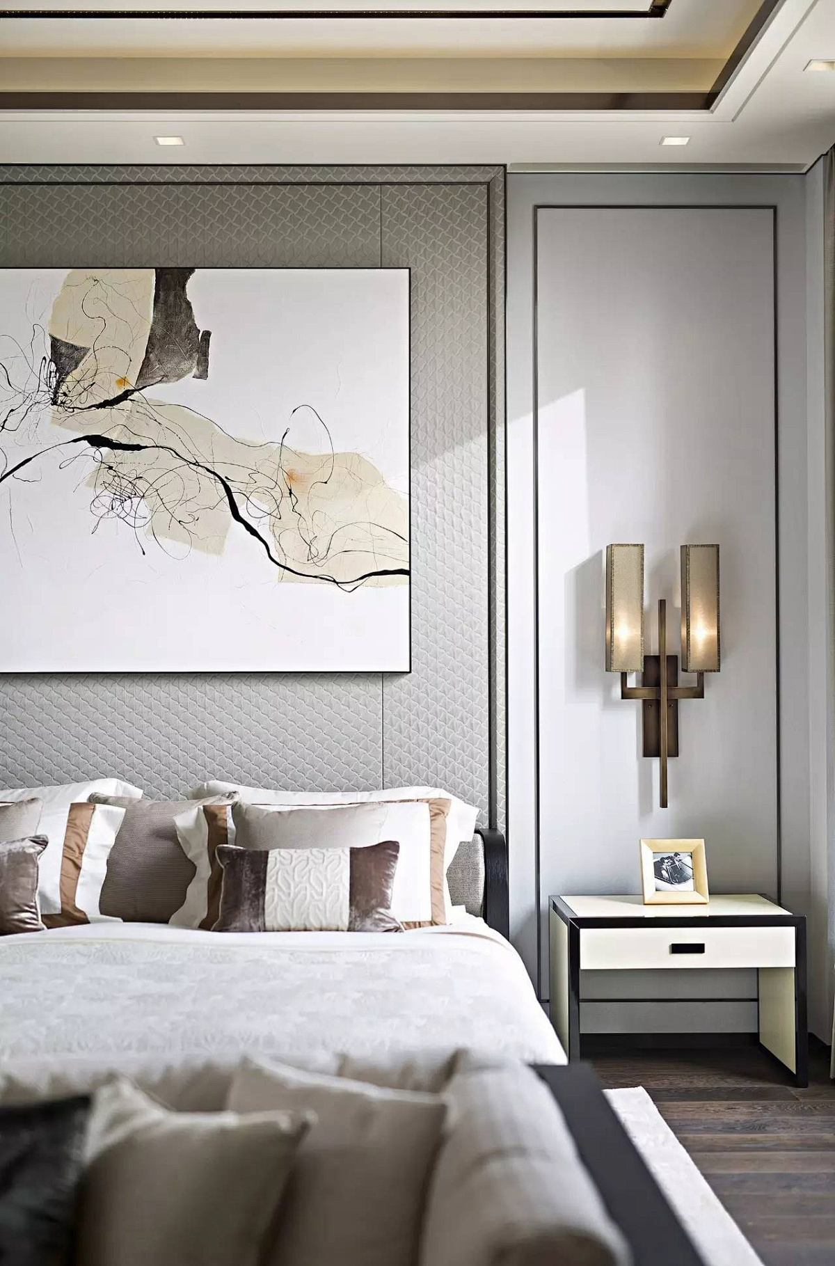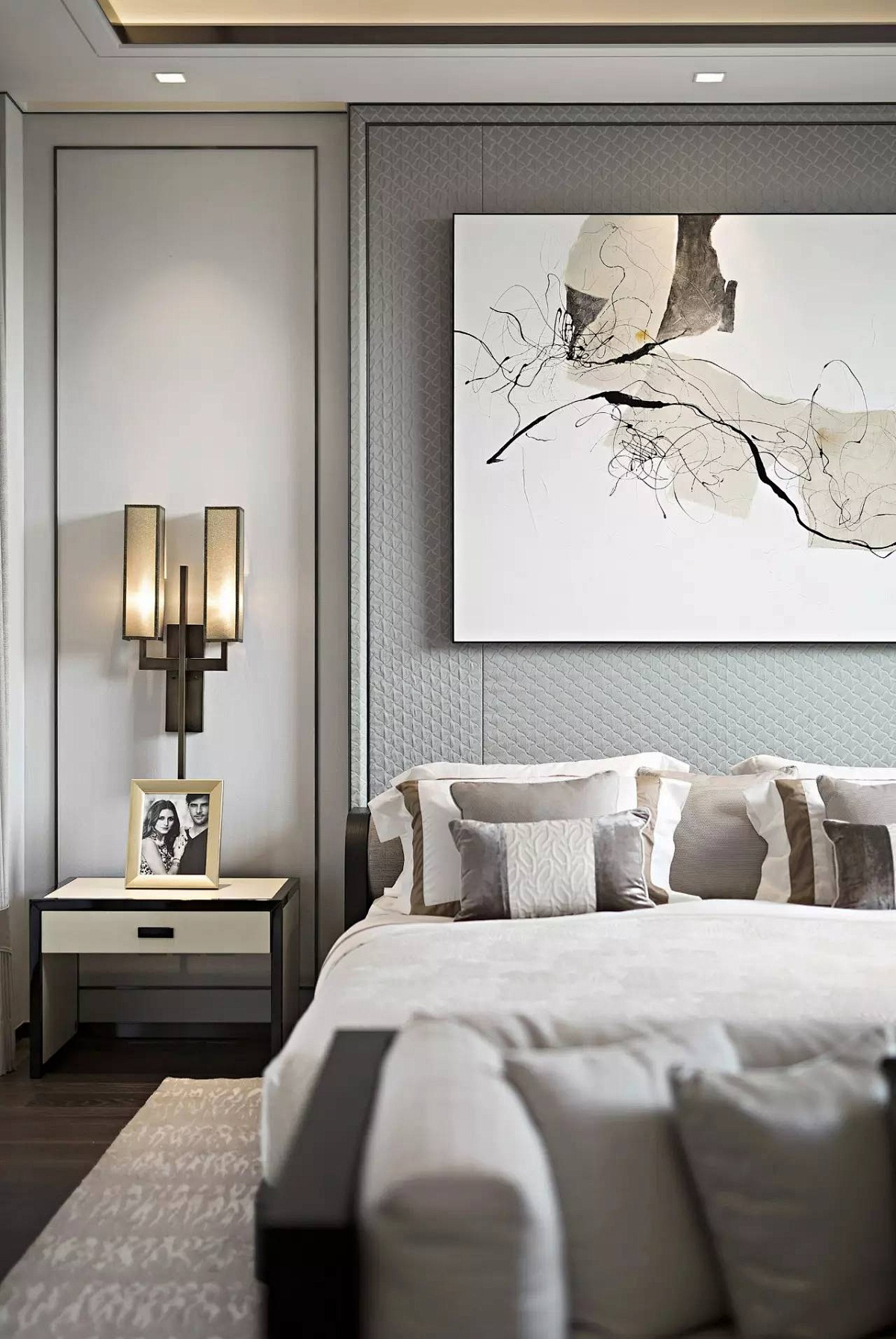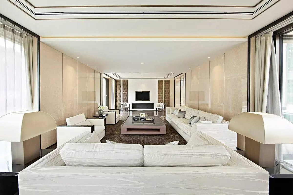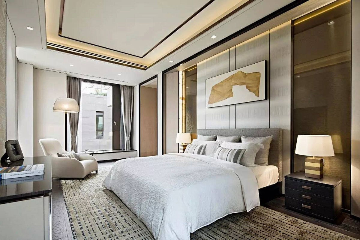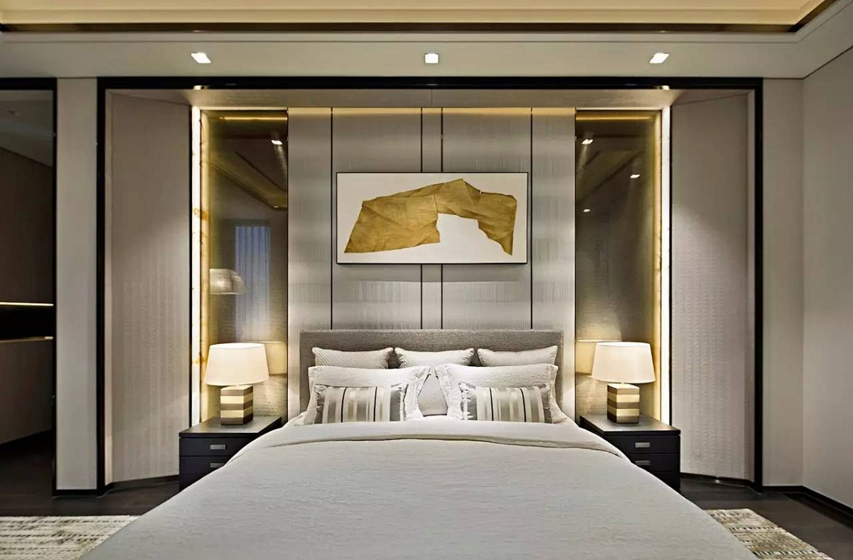 The other end of the mansion is the sleeping area. The family room is connected to the entrance design, and the walls on both sides are decorated with highly textured light gray woven leather, paired with light gray sofas and square double chairs, adding a warm and harmonious atmosphere to the luxurious atmosphere.