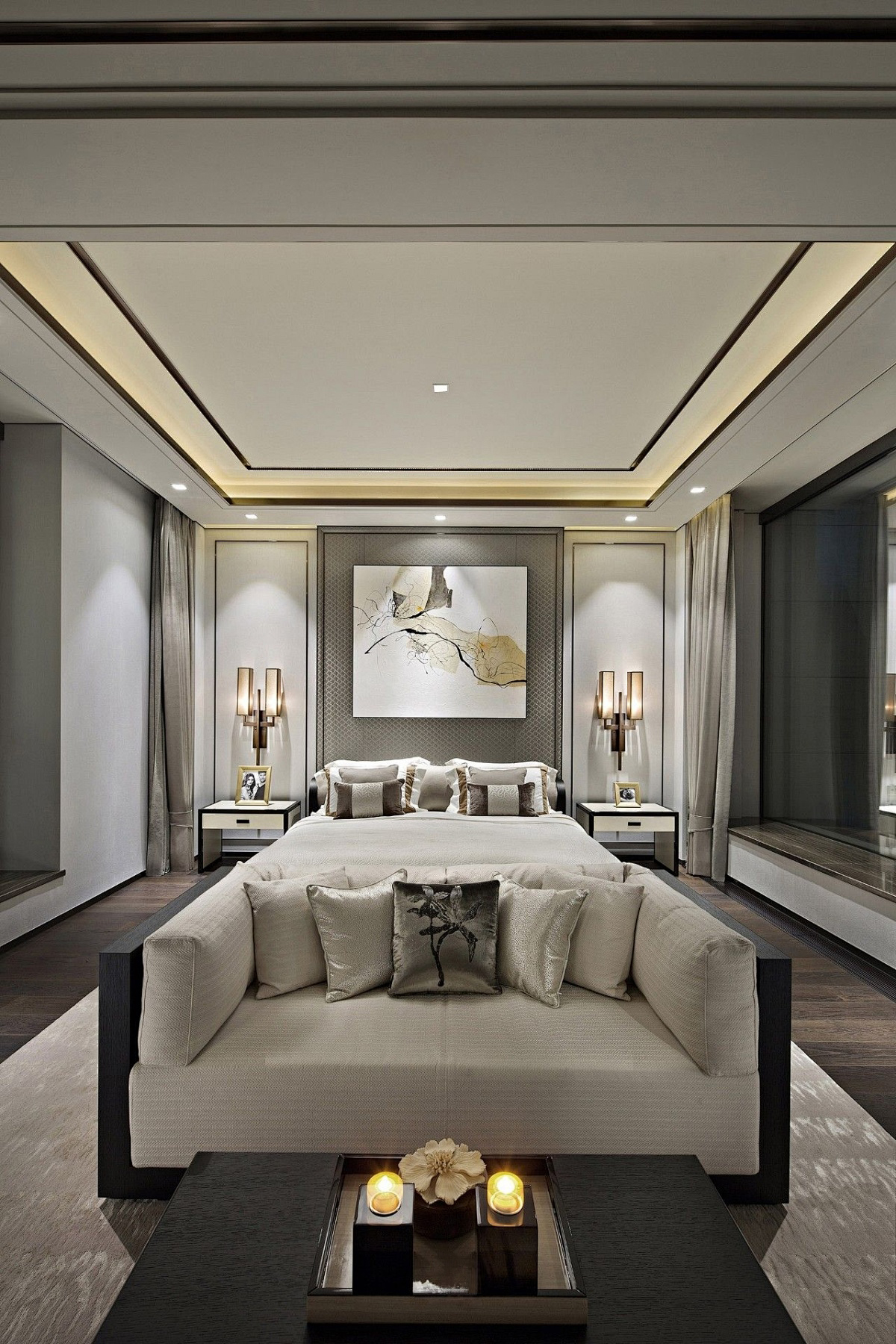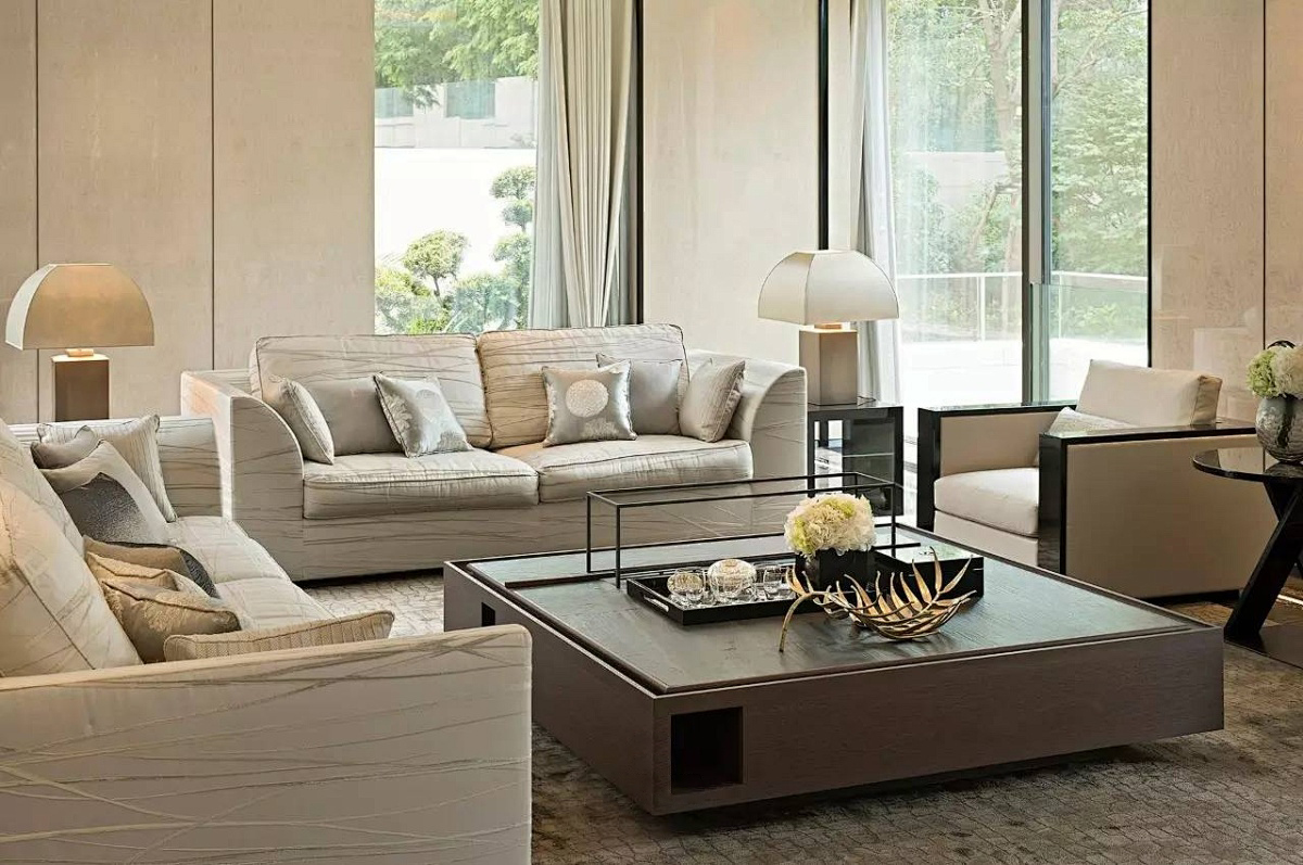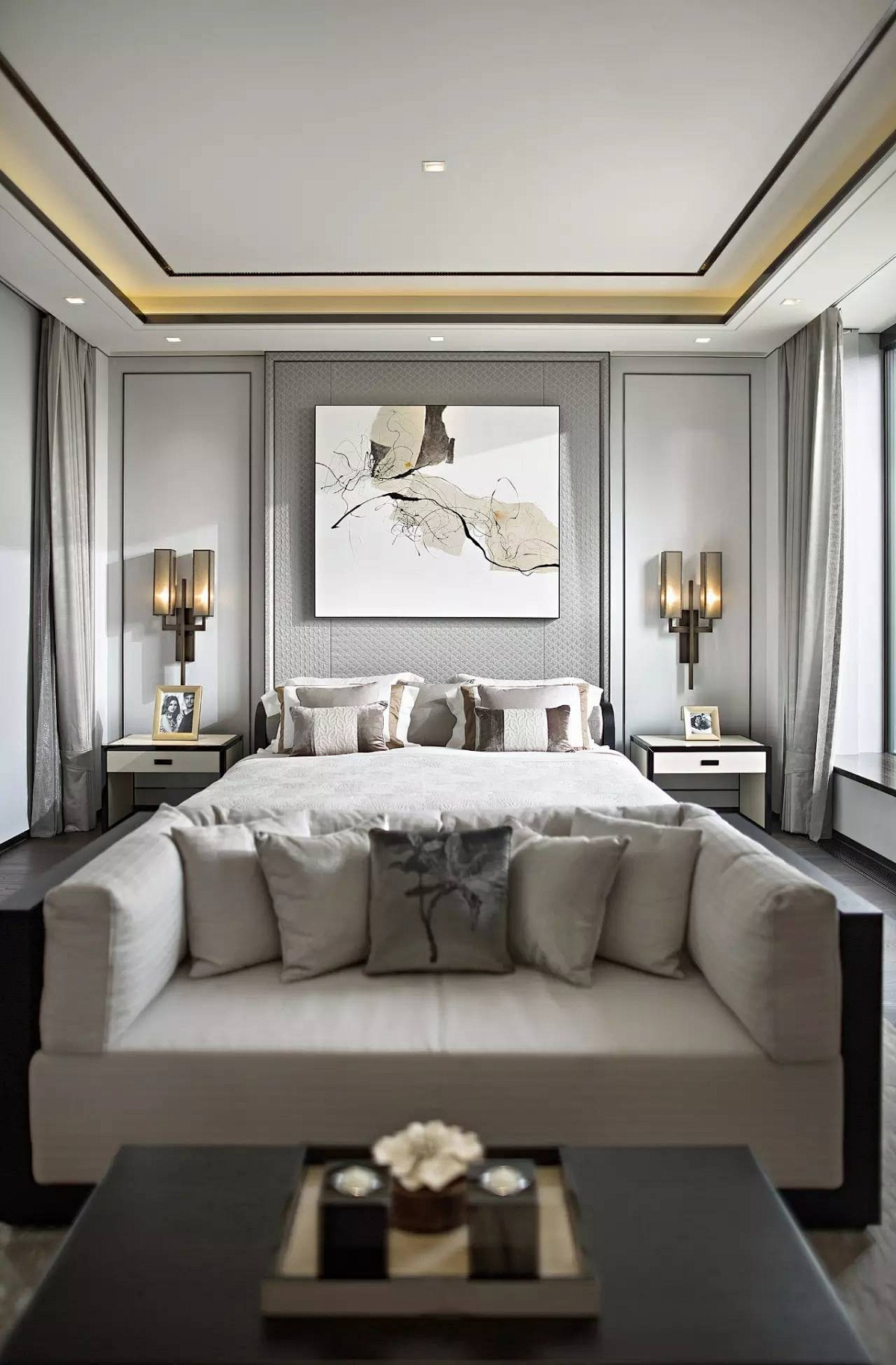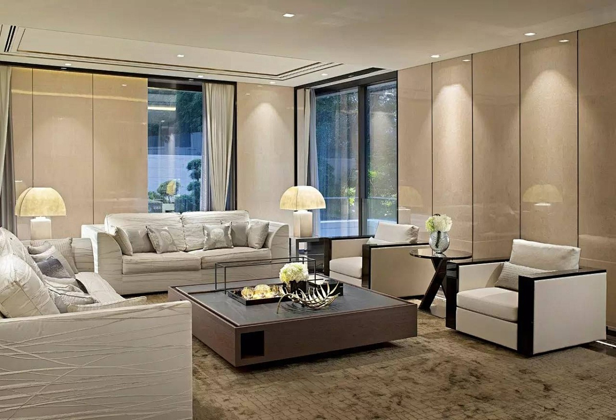 The other end of the mansion is the sleeping area. The family room is connected to the entrance design, and the walls on both sides are decorated with highly textured light gray woven leather, paired with light gray sofas and square double chairs, adding a warm and harmonious atmosphere to the luxurious atmosphere.