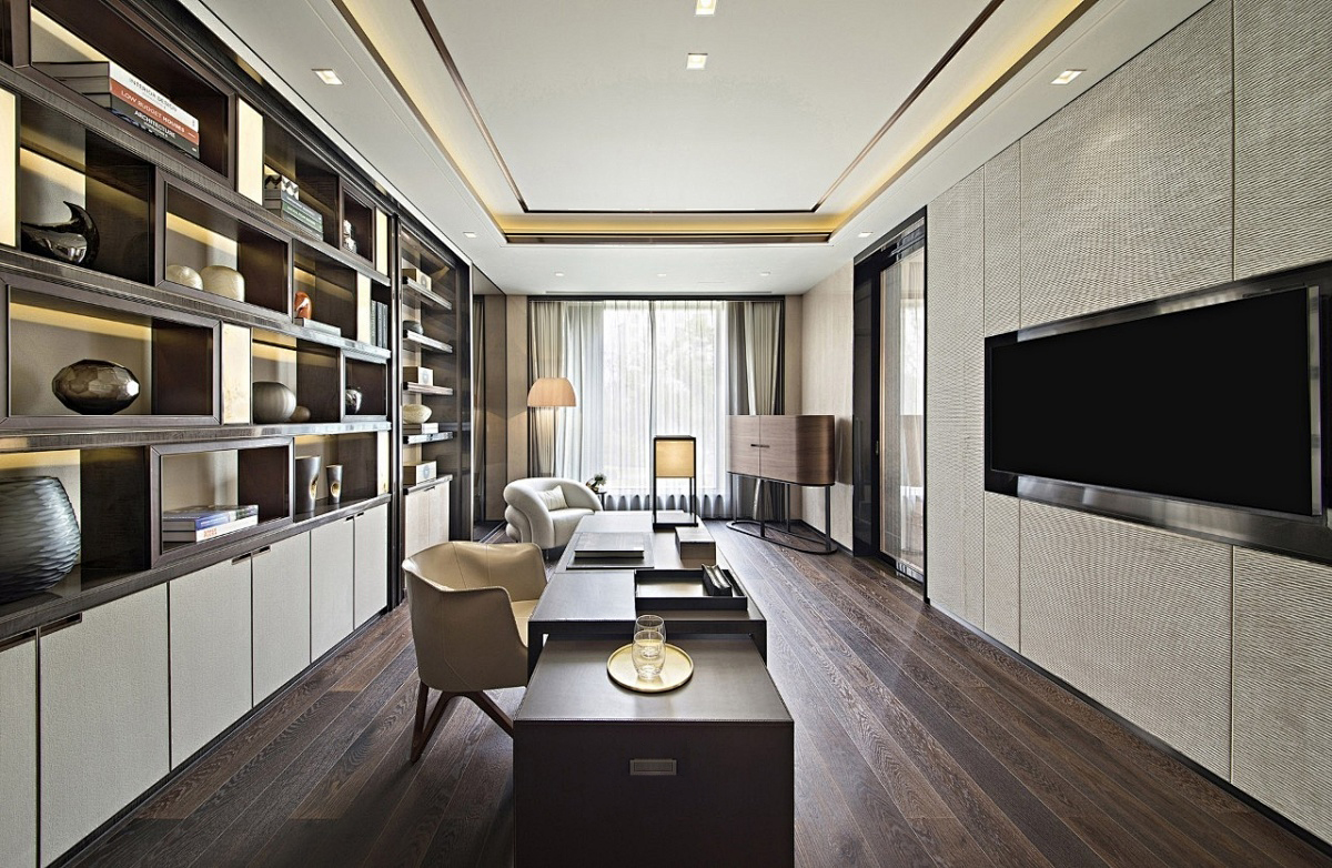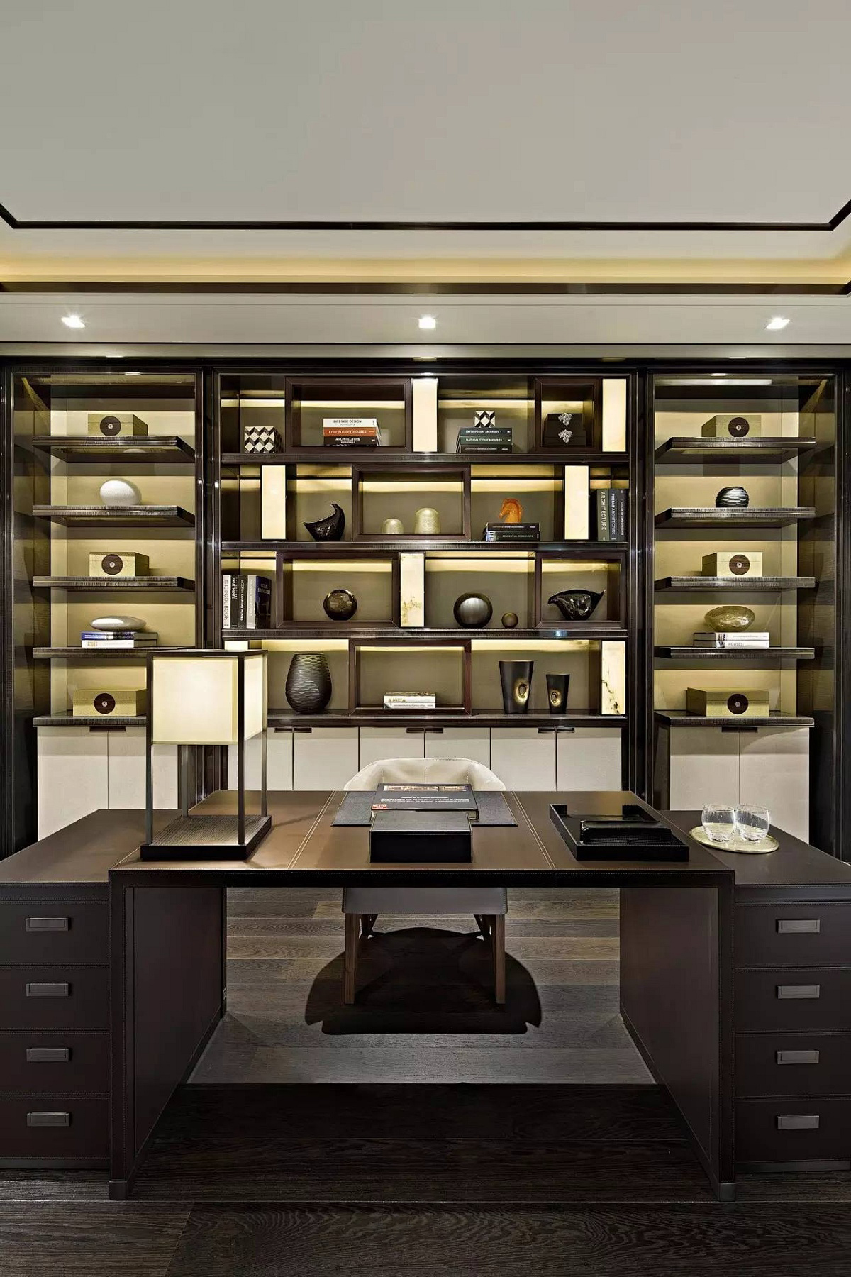 The feeling of the study is completely different from that of a family room. The dark brown wooden floor is paired with wooden furniture with a dark tone as the main tone, and then decorated with artistic furnishings in the same color range, gathering cultural connotations from ancient and modern times, both domestically and internationally, adding an artistic and cultural atmosphere to the elegant workspace.