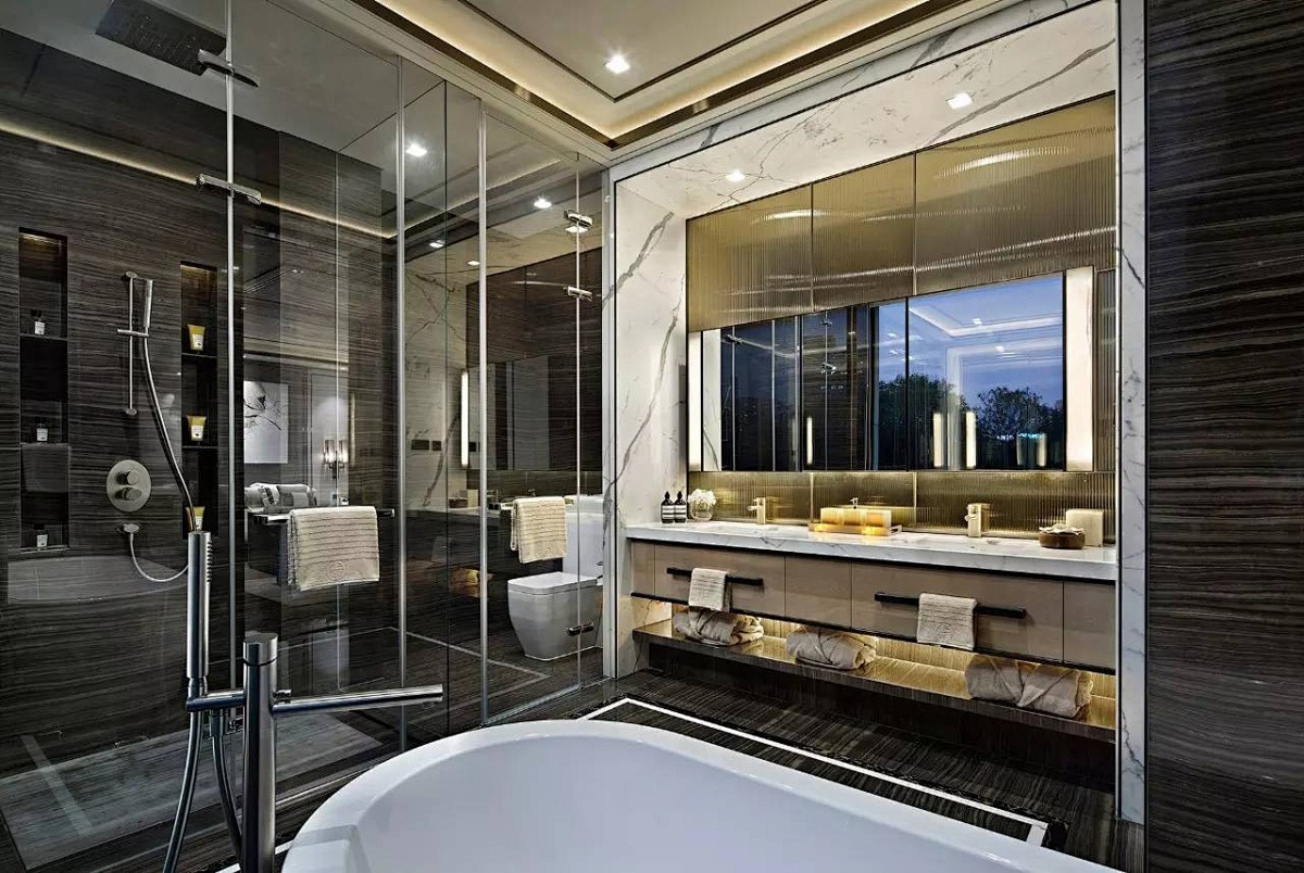 The bathroom adopts a dual washbasin design, with a glass cabinet and fully equipped high-end sanitary ware, creating a luxurious and fashionable bathroom space.