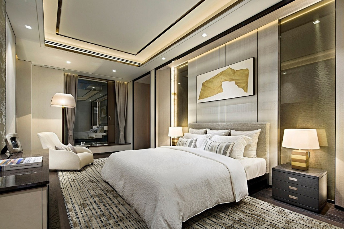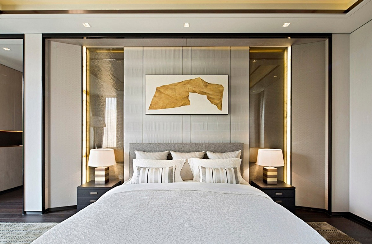 主人套房的床背墙以米色几何硬扪皮饰面配搭古铜色拉丝不锈钢,与暖灰色的硬扪布电视墙遥相呼应,感觉惬意悠然。房内设独立的男女主人衣帽间,户主夫妇均可享受静谧幽雅的私人空间,悉心配衬装扮出席各种场合。主人浴室采用双洗手台设计,以夹丝玻璃配衬棕色硬扪织皮饰框的镜柜,加上设备齐全的高档洁具,打造矜贵时尚的卫浴空间。