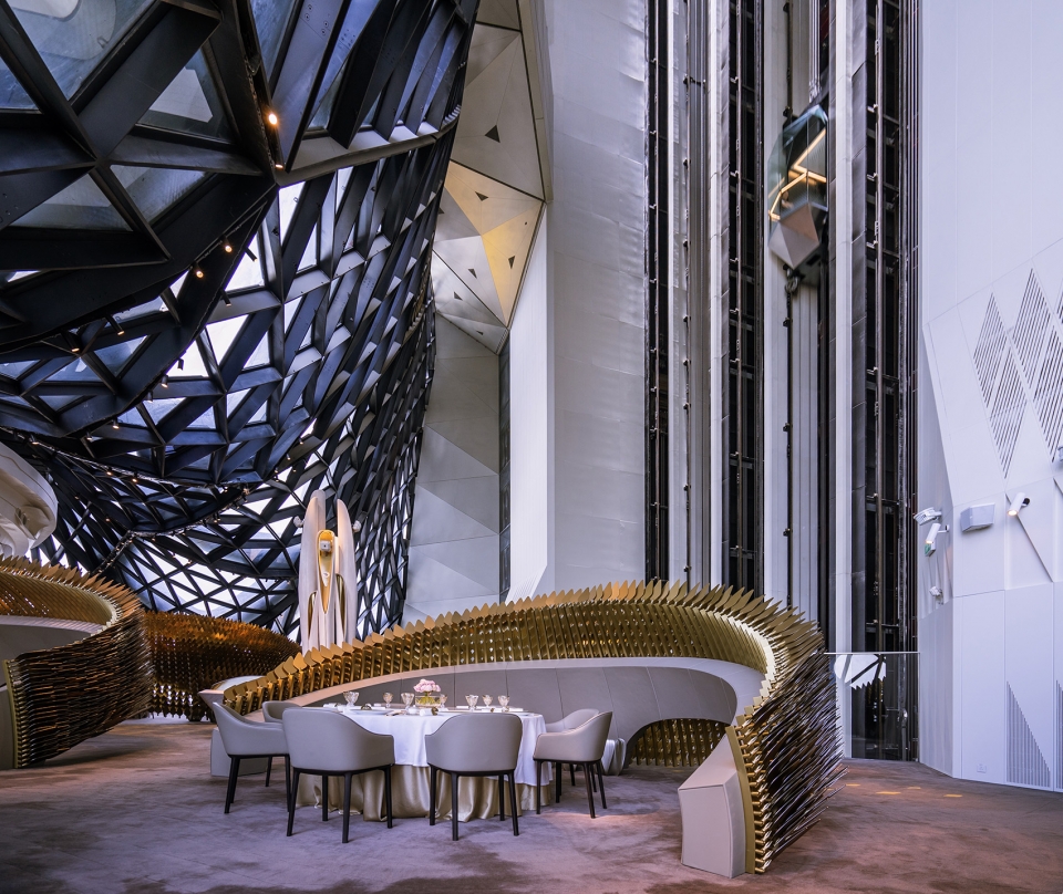 由扎哈·哈迪德建筑事务所设计的Morpheus酒店是澳门梦之城开发项目中的全新旗舰酒店。这一耗资10亿美元的酒店拥有一个如骨架般连续不断的独特室内空间,此次UAP事务所将与扎哈·哈迪德事务所共同合作,为酒店中庭的一系列用餐空间制定设计和安装方案。5个独特的“舱体”(方案共设计了9个)将被引入餐厅中庭,作为私人化的用餐空间使用。而透过中庭“骨架”的空隙,则可以一览澳门的城市美景。