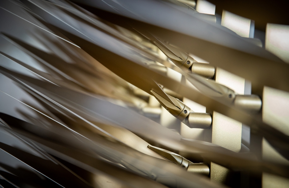 Utilizing a range of fabrication methods, the design ensures that the exterior surface of the pods creates a highly textured and rhythmic patternation of coloured blades. Each individual blade is connected back to the main structure and allows a 360 degree pivot to provide the desired sculptural effect. Viewers moving past the work are offered fleeting glimpses into the interior of the pod, whilst the blades orientated at multiple angles provide a discreet space within. The internal skin of the pods are clad in a light coloured leather creating a warm and intimate space for diners to relax and soak in the surrounding architecture and environment.