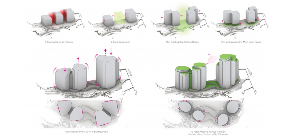 Divided into a series of interconnected ‘petals’ each with a different orientation and height, the towers define a dynamic silhouette on the West Kowloon’s skyline. The top of each tower tapers inward to reduce their perceived volume while the façade’s vertical shading pleats extend over each rooftop, creating ‘halos’ that shelter roof terraces and sky gardens.