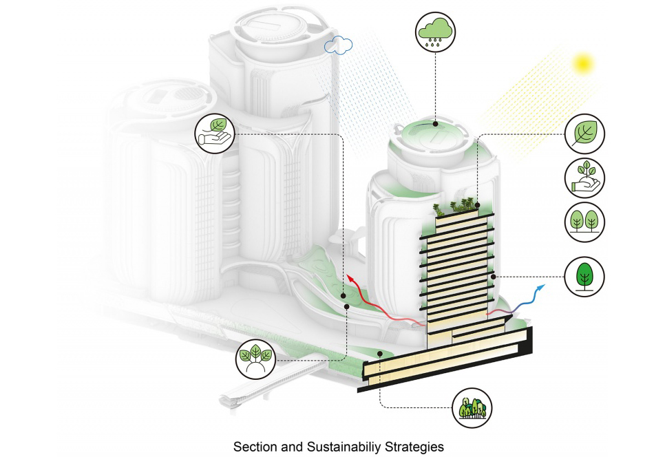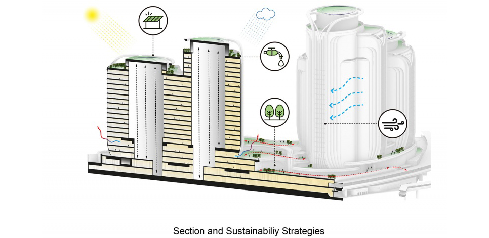 这些塔楼与车站上方的新景观平台和市民广场交织在一起,建筑体量从较低的楼层开始逐渐向内收缩,以减少占地面积,同时增加户外空间,促进人的流动和空气的流通。