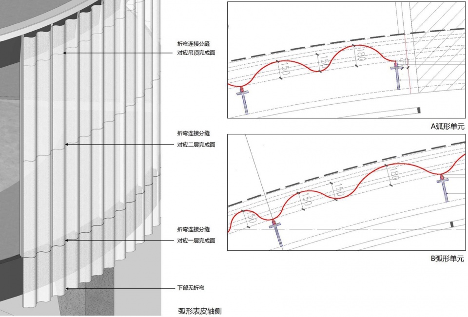 日熹阁的外立面并非传统意义上的封闭立面,而是一个开放的“空间装置”。其空间与“神秘面纱”共同形成了“灰空间”。金属板表皮采用穿孔曲折板的形式,可以让立面有似一层轻盈通透的薄纱:其折板状的设计本身具有良好的受力性能,可以减少次级龙骨的使用,而A与B两种不同曲度折板的组合也使得整体立面轻柔婉约而富有变化,有如自然的飘逸随性。这种表皮的设计不仅赋予建筑轻透的视觉效果,还通过双向的视线连接,模糊了室内外空间的界限,营造出宁静且诗意的氛围。