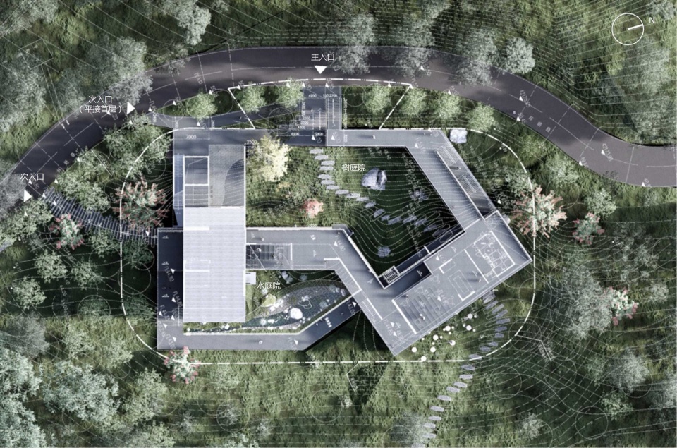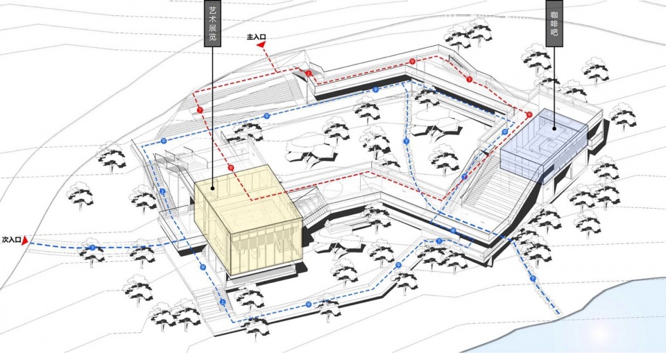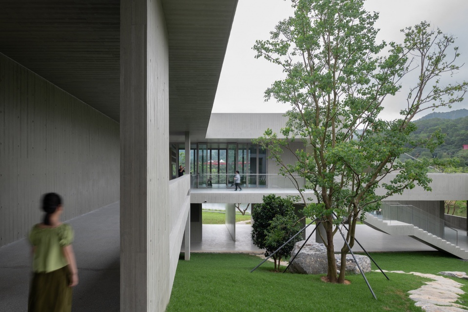 漫步的流线,像是书卷长轴, 顺应着标高徐徐展开,通过廊道、坡道台阶和平台的上下串联或并联,与咖啡、展览等功能空间相遇,与自然相互借景,构成了高低错落、移步易景的循环路径,营造出“观”的动感和漫步体验;而廊道内的窗洞设计, 运用了借景、对景、框景等手法,将不同层次的“景”——植入的特色树木及山石等元素的庭院及远近的自然景观,引入室内,制造了“观”的戏剧性和立体感, 形成不同视角的层次感和深度感,既丰富了空间层次感,也增添了趣味性。