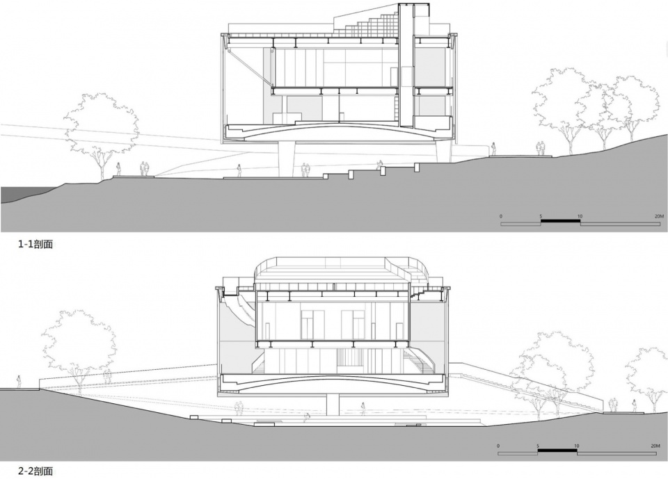 日熹阁在圆形场地的限制下,建筑通过功能叠加的方式巧妙布局,将不同的功能区域有效地组合。由于结构和材料的差异,各层的层高有所变化,既改变了每层的视觉效果,也带来了独特的景观视野。这种设计不仅增强了空间的层次感和多样性,还在有限的圆形场地中展现了建筑的独特韵味和美学体验。设计试图在有限的场地上充分利用四维时空,通过“建筑散步”(Promenade Architecturale)的立意,让建筑内部的空间顺应自然景观,在不同高度及功能之间发生交替、切换和变化,为人们提供了丰富的视觉体验与空间探索感。